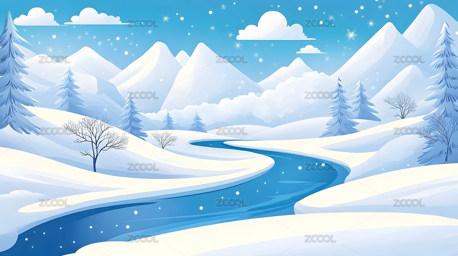 冬季大雪节气插画,雪景中的冬天河流场景插