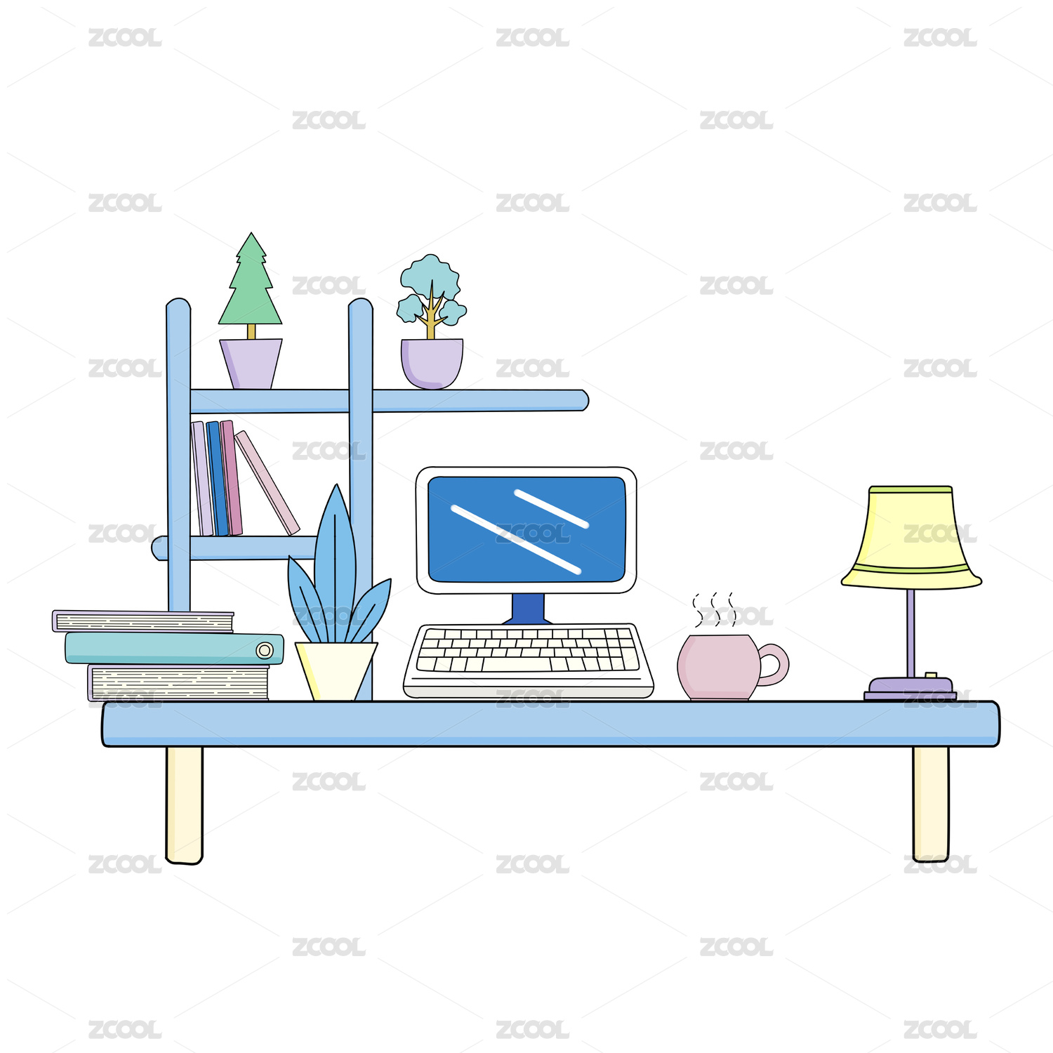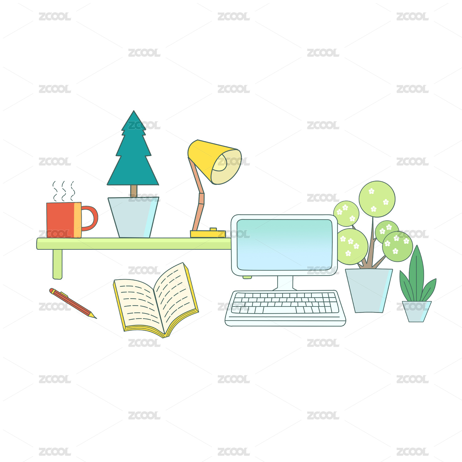 工作台,桌面,办公设备,办公室,办公桌,文件,书籍,绿植,扁平插画,描边插画