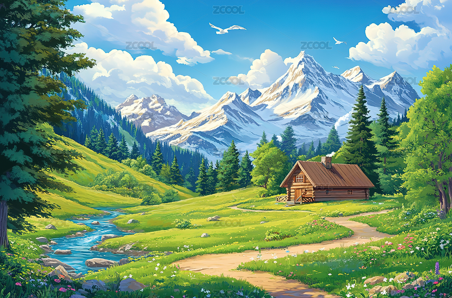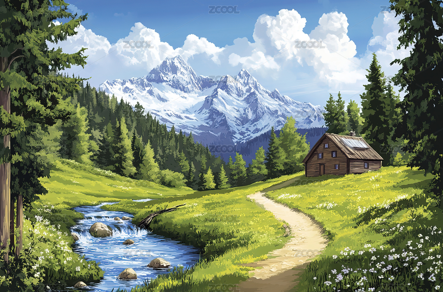 雪山溪流与小木屋