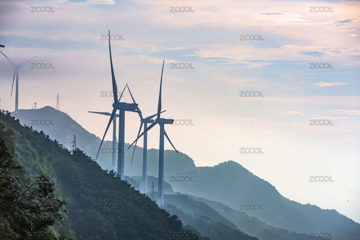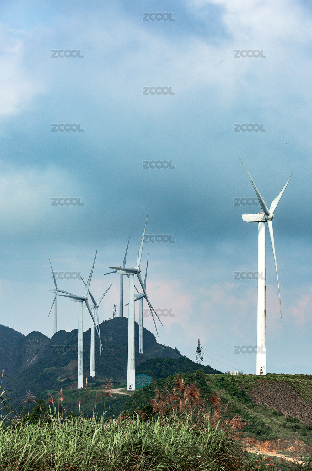 郊区山脉上的风力发电风车