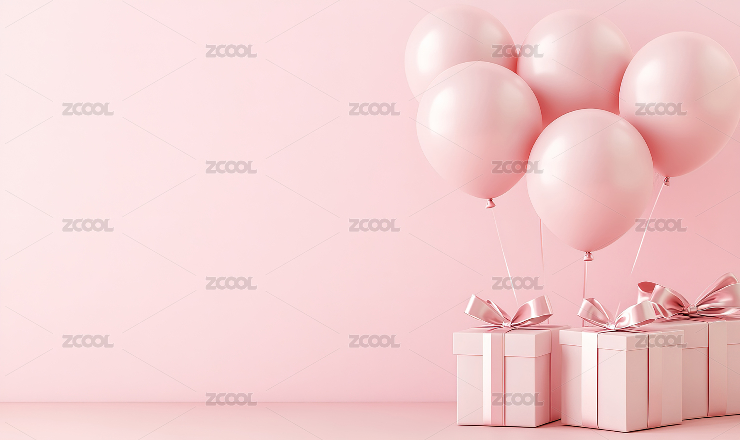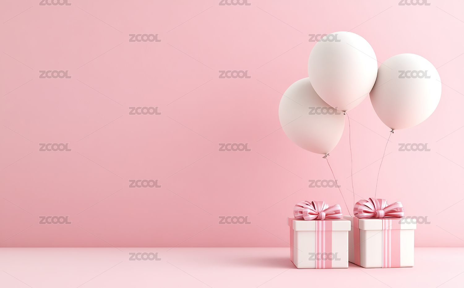 粉红色背景下的气球和礼品盒特写镜头