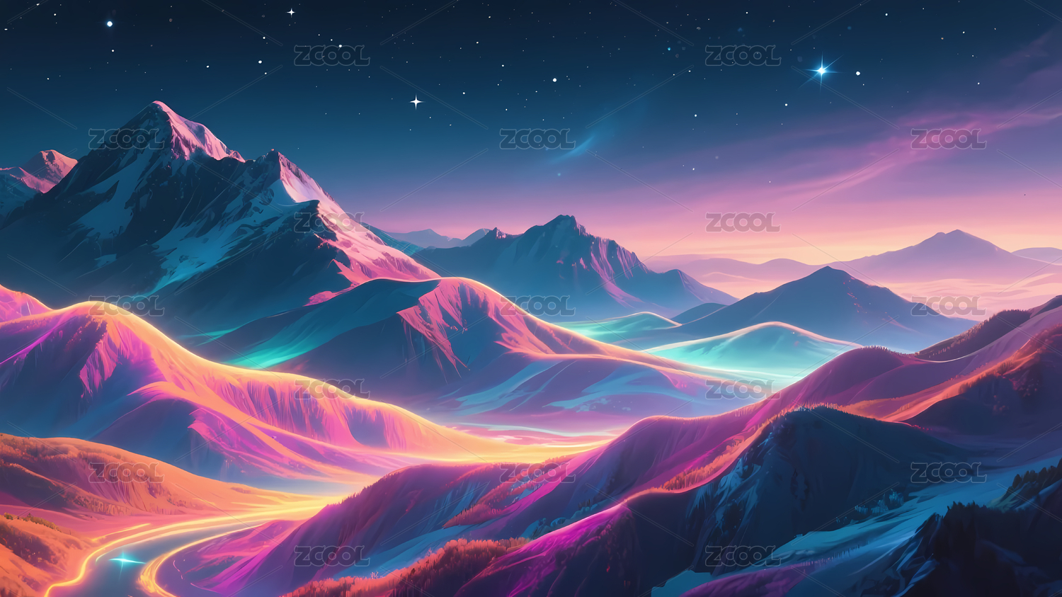 色彩斑斓夜空壮丽山峦
