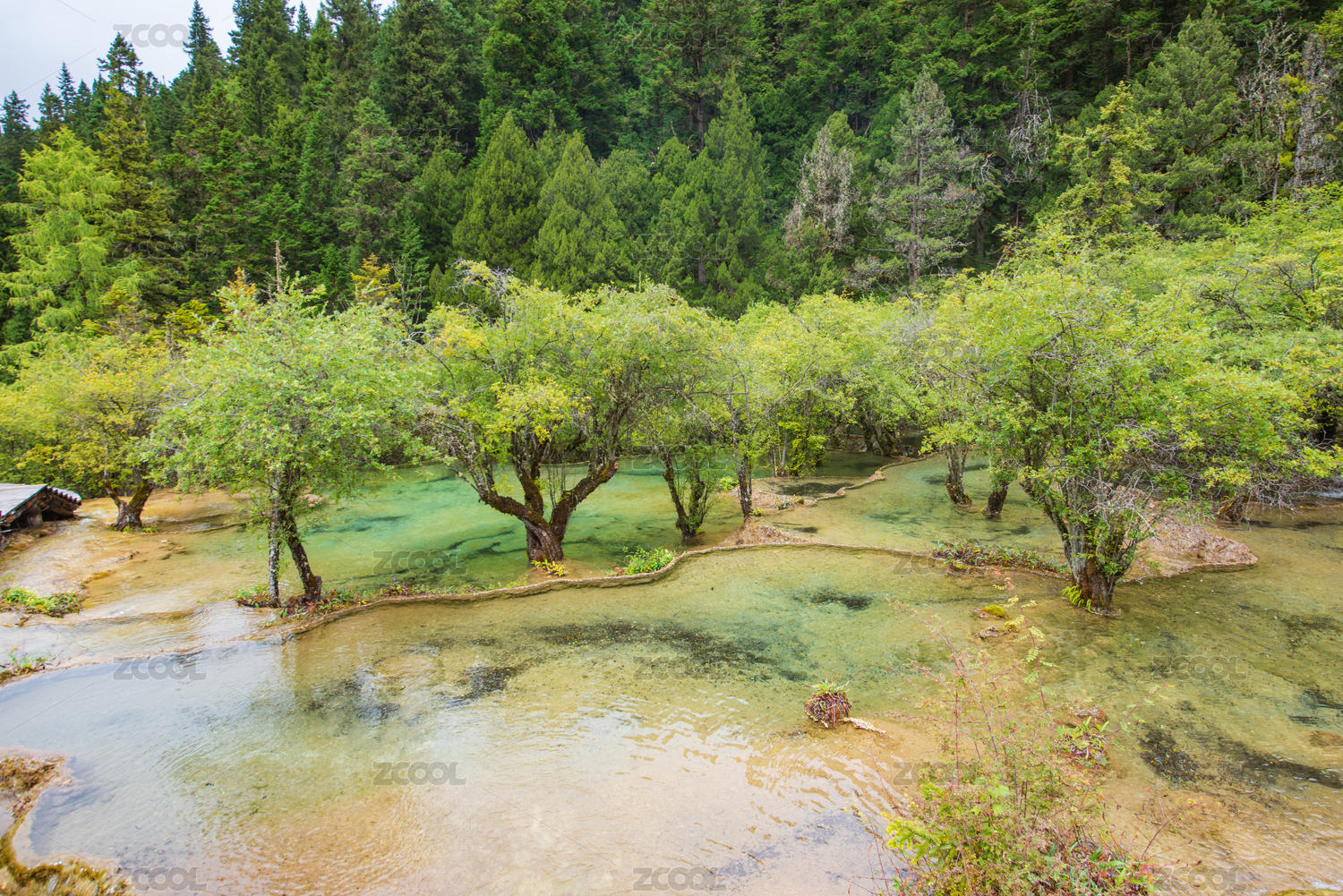 四川,黄龙,雨天,靛蓝,树木,瑶池,五彩池,彩池,水,地质