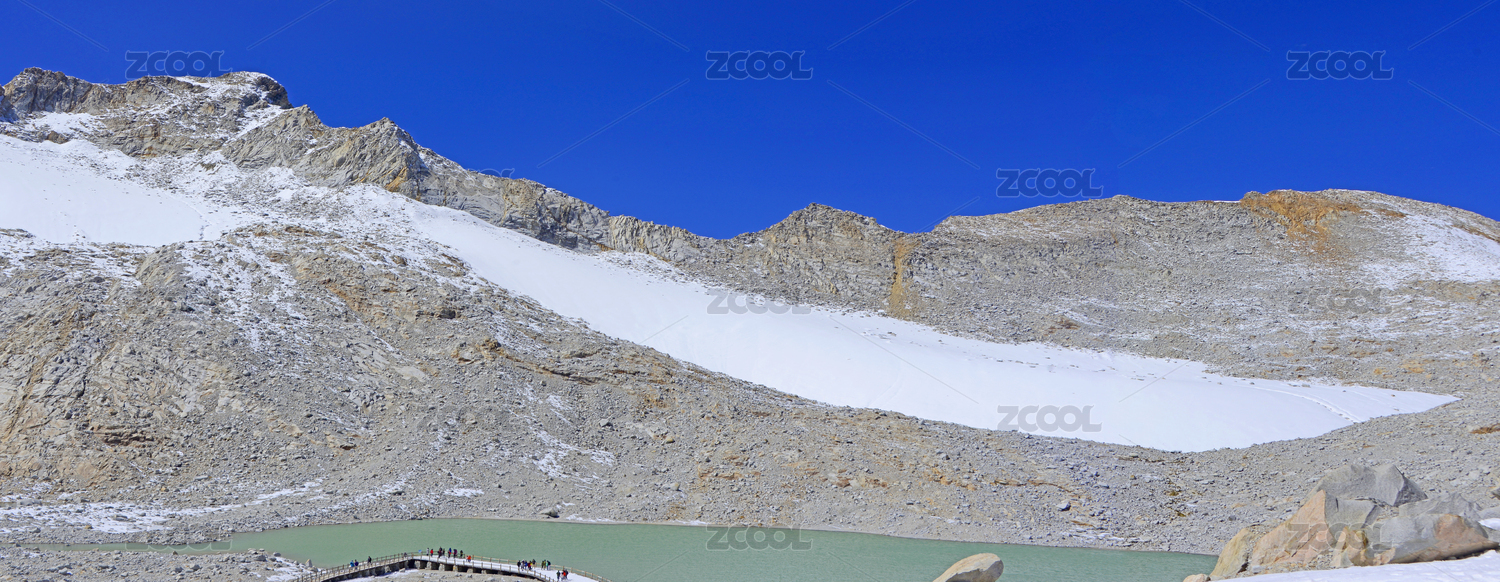 四川省阿坝达古冰川雪山下湖边观景平台和栈道