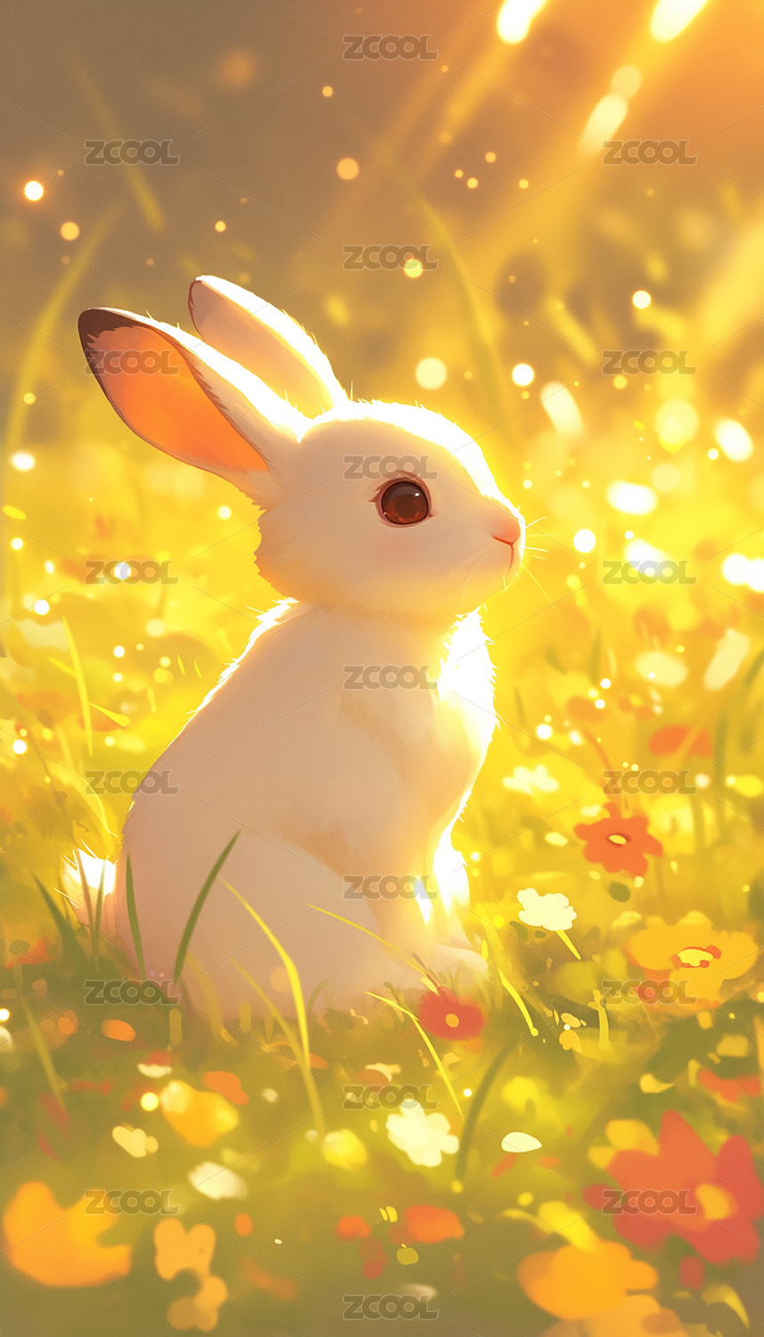 唯美黄色背景户外草地上的小白兔