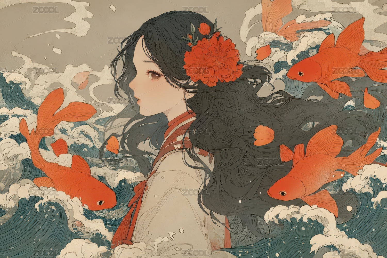 黑发少女与红鱼共舞的波涛画卷