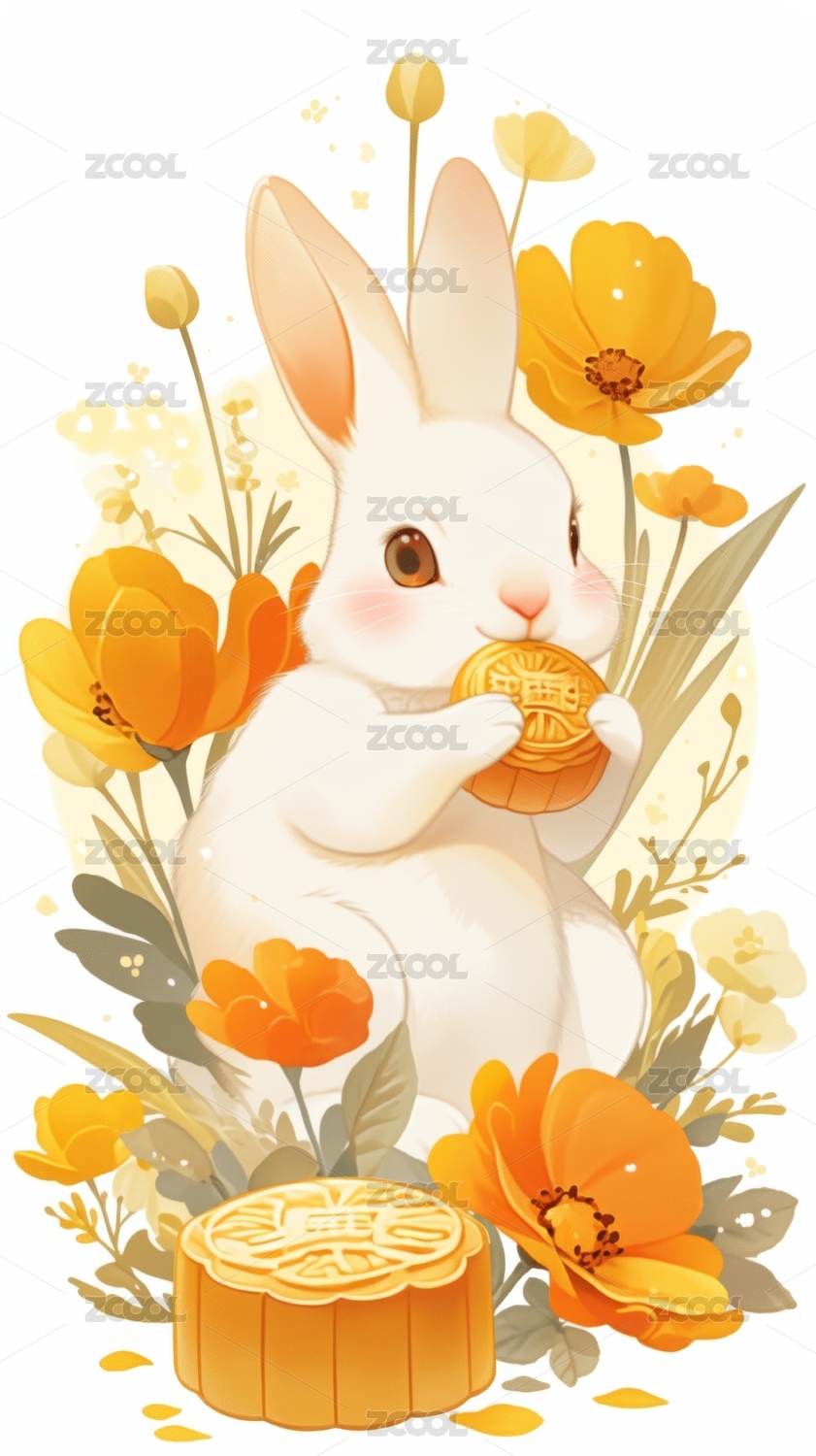 兔子手持月饼花丛环绕