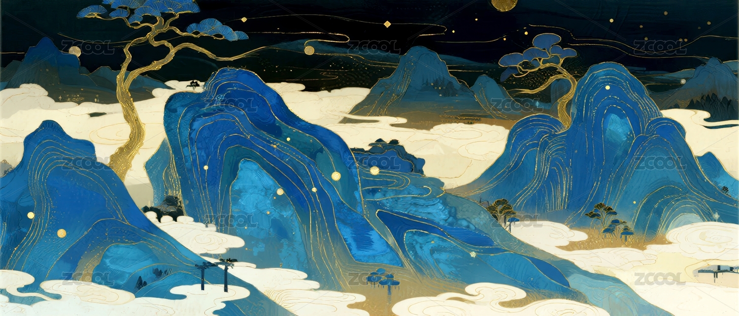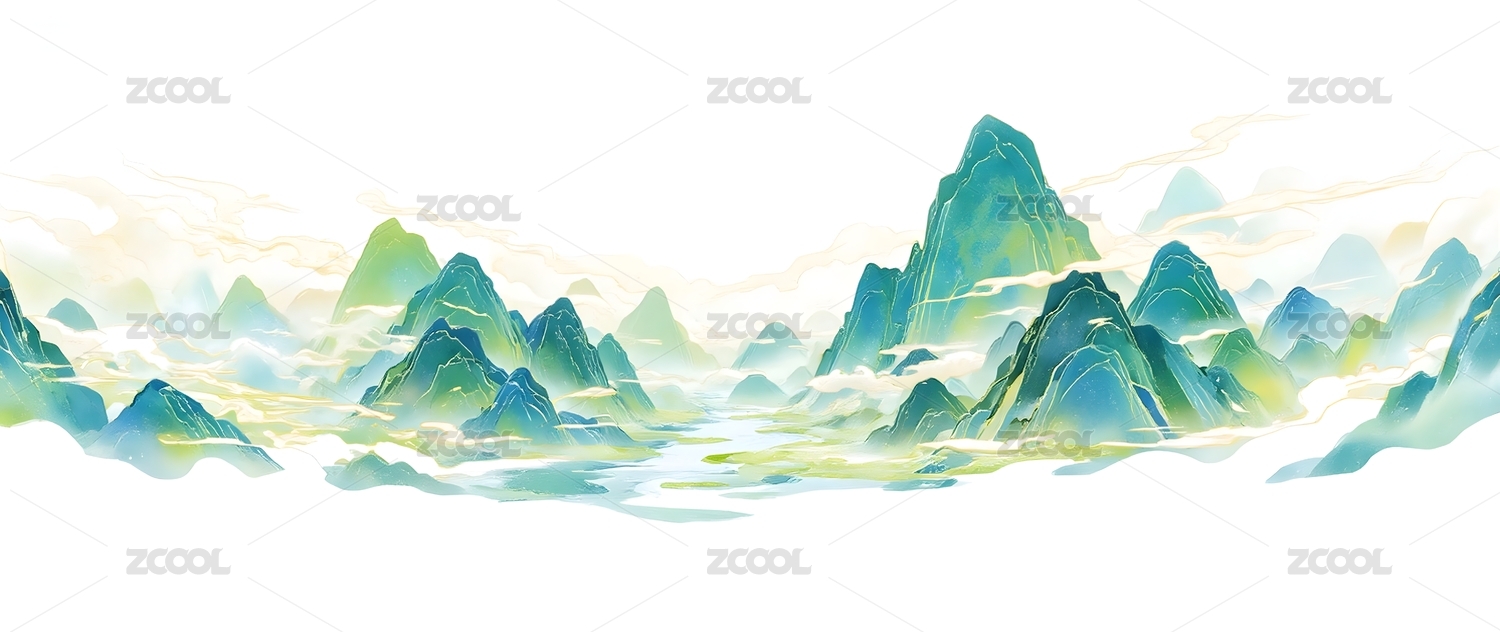 中国风,水墨,绿色,建筑,山,高山,水,风景,自然