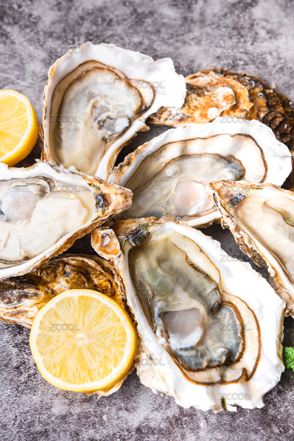 黑石底上放着一堆新鲜生蚝和撬开的海蛎子