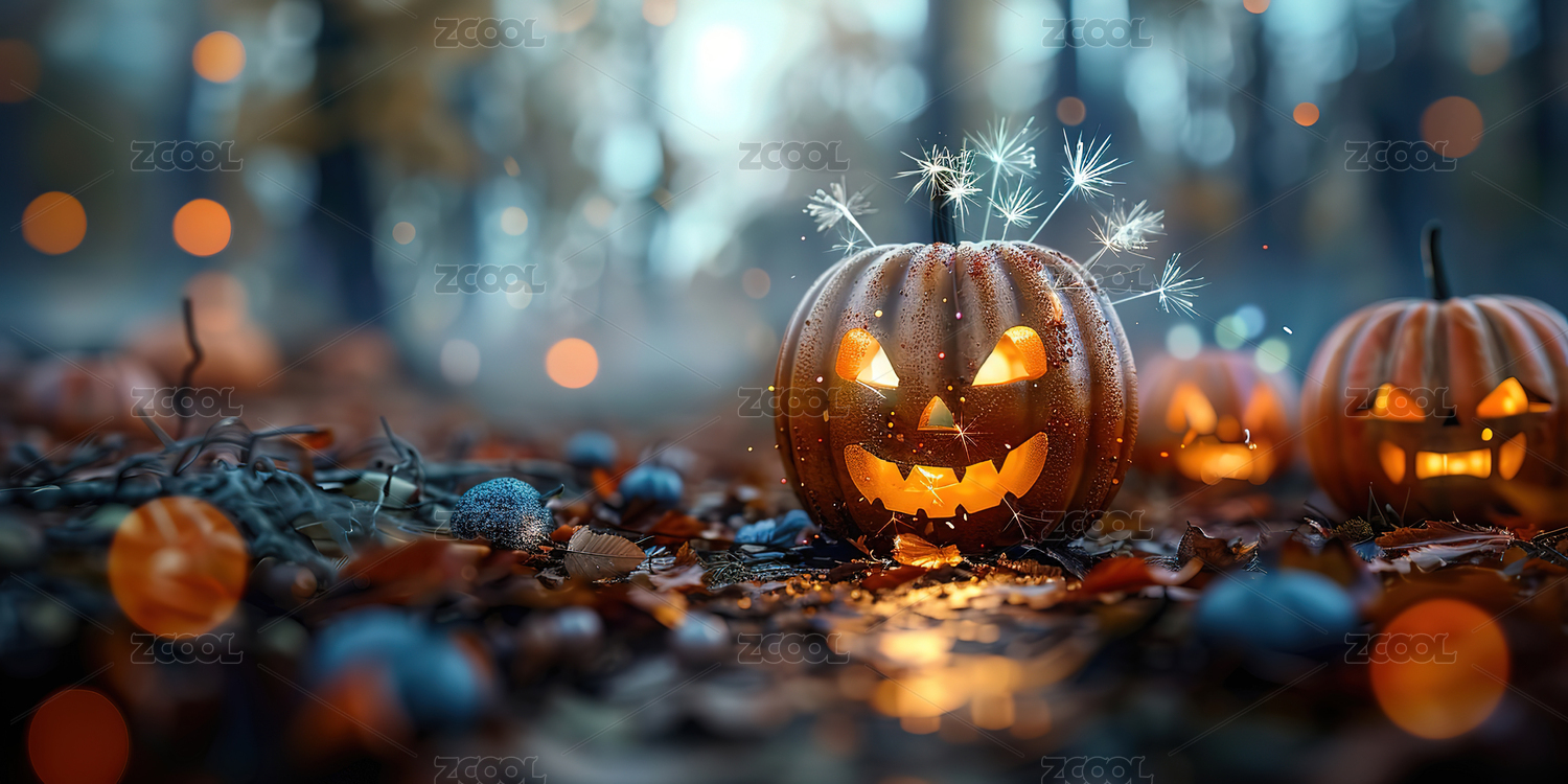 万圣节南瓜灯笼在幽灵般的树林里闪耀