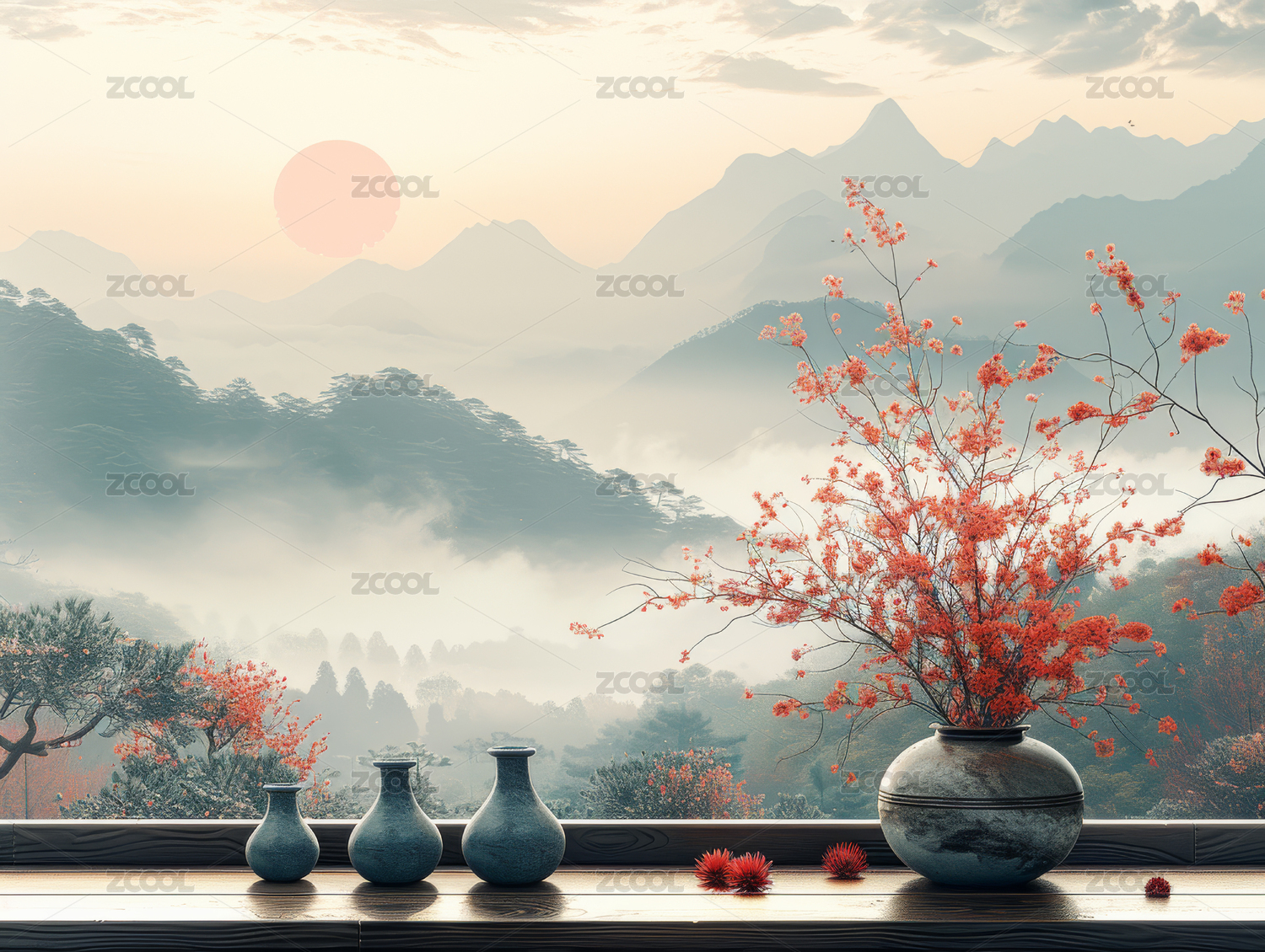 中式山水背景前的雅致花瓶