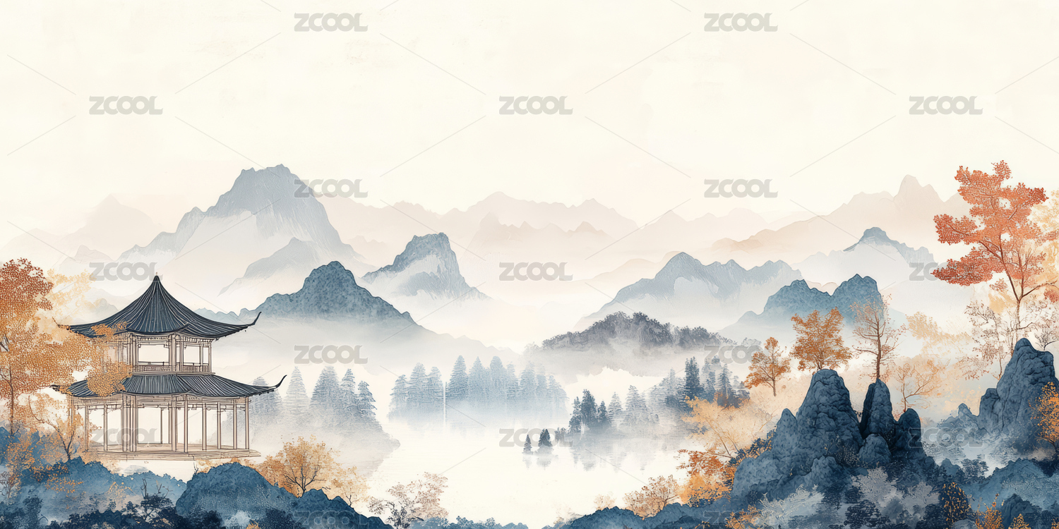 中国元素,中国文化,传统,古典,山水画,国风,极简,山岳,湖,船