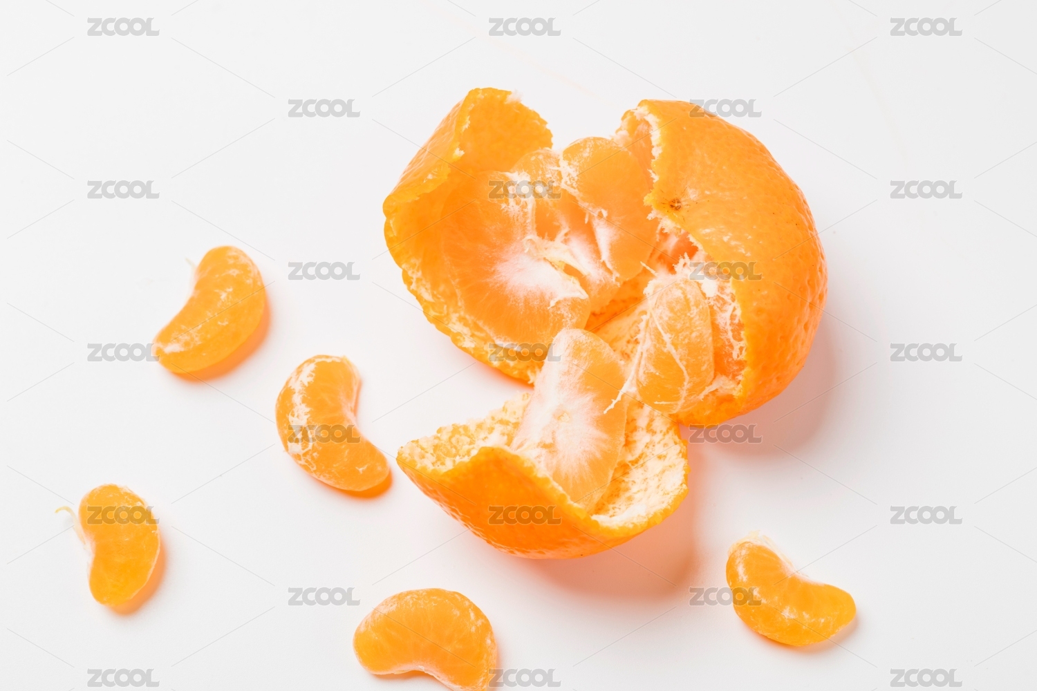 白色背景里摆着剥开的砂糖橘