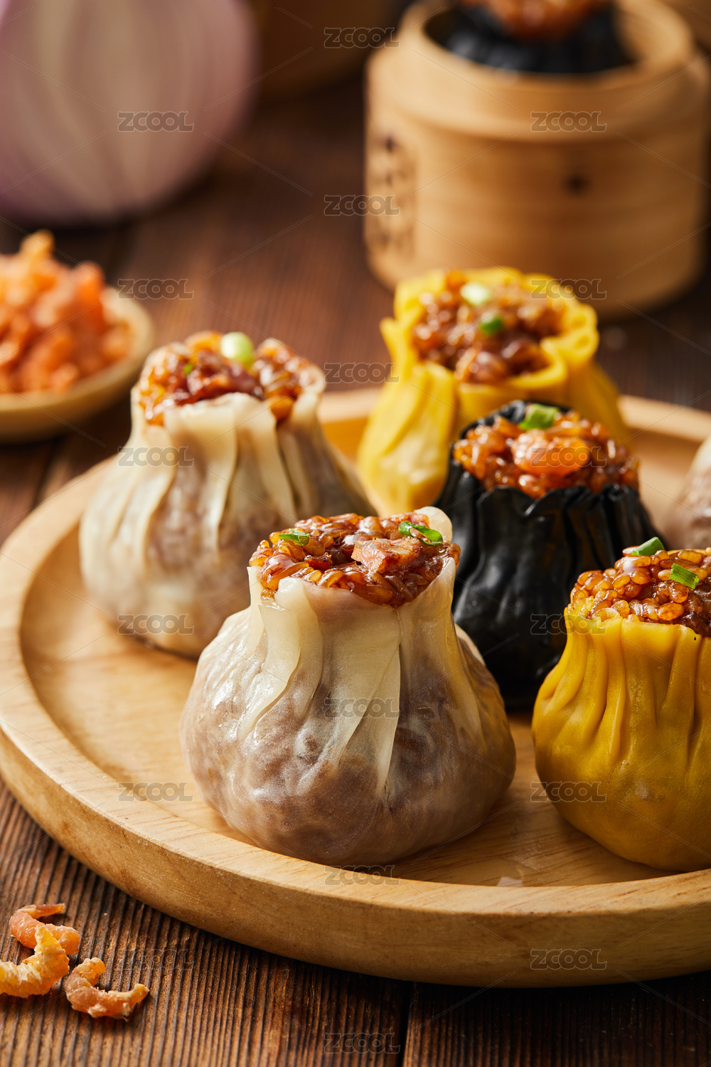 木板背景上满满一盘烧卖