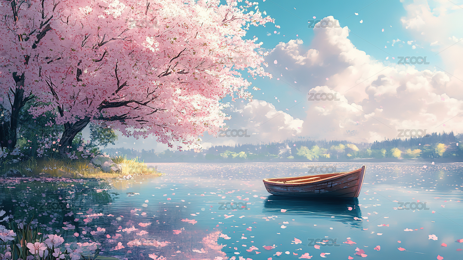 樱花树下的静谧湖面
