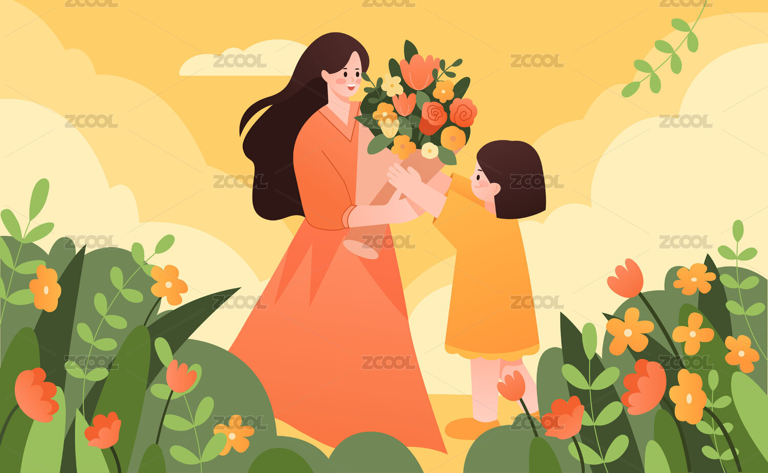 母亲节女孩给妈妈献花插画感恩节礼物海报