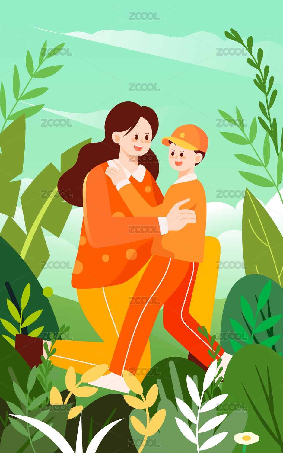 感恩母亲节母子拥抱插画一家人户外旅行海报