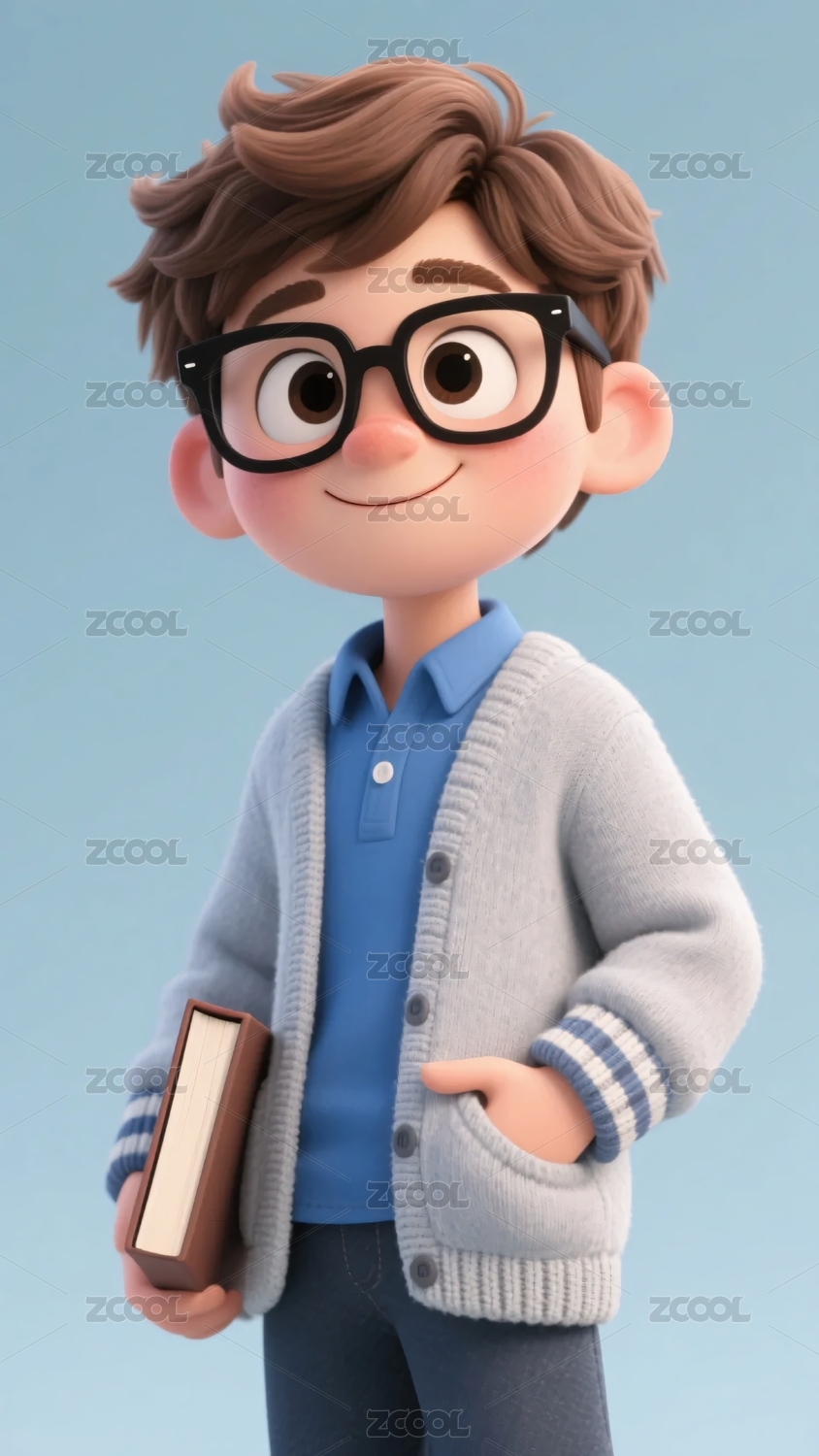清新可爱拿着书的短发眼镜男孩3D立体插画