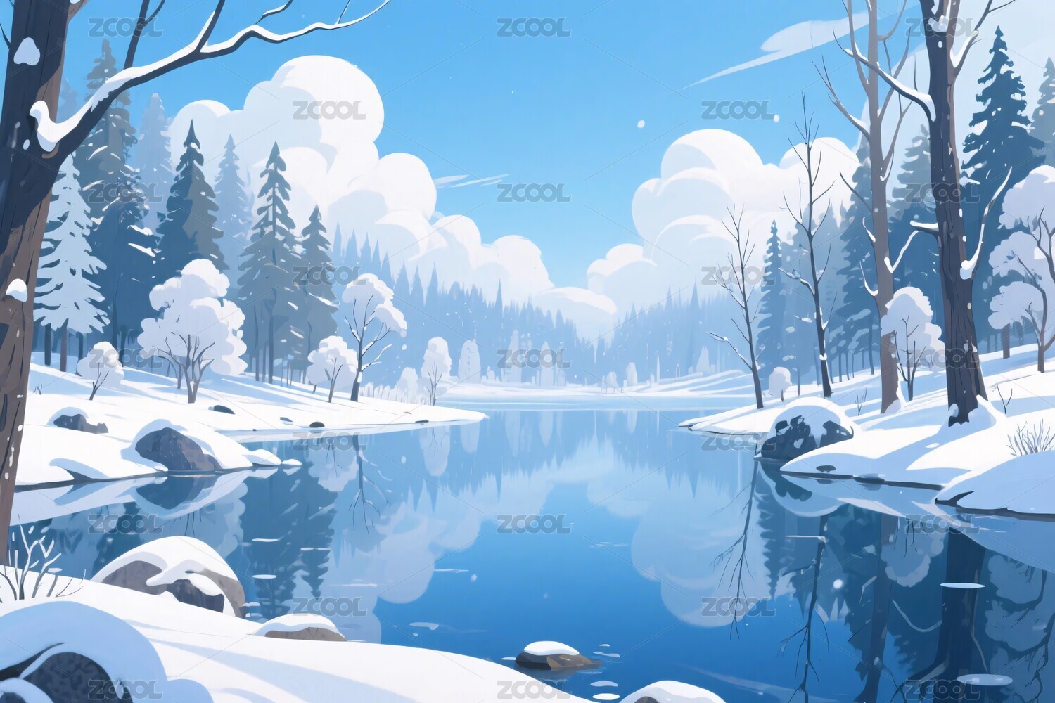 冬季大雪节气插画,雪景中的冬天河流场景插