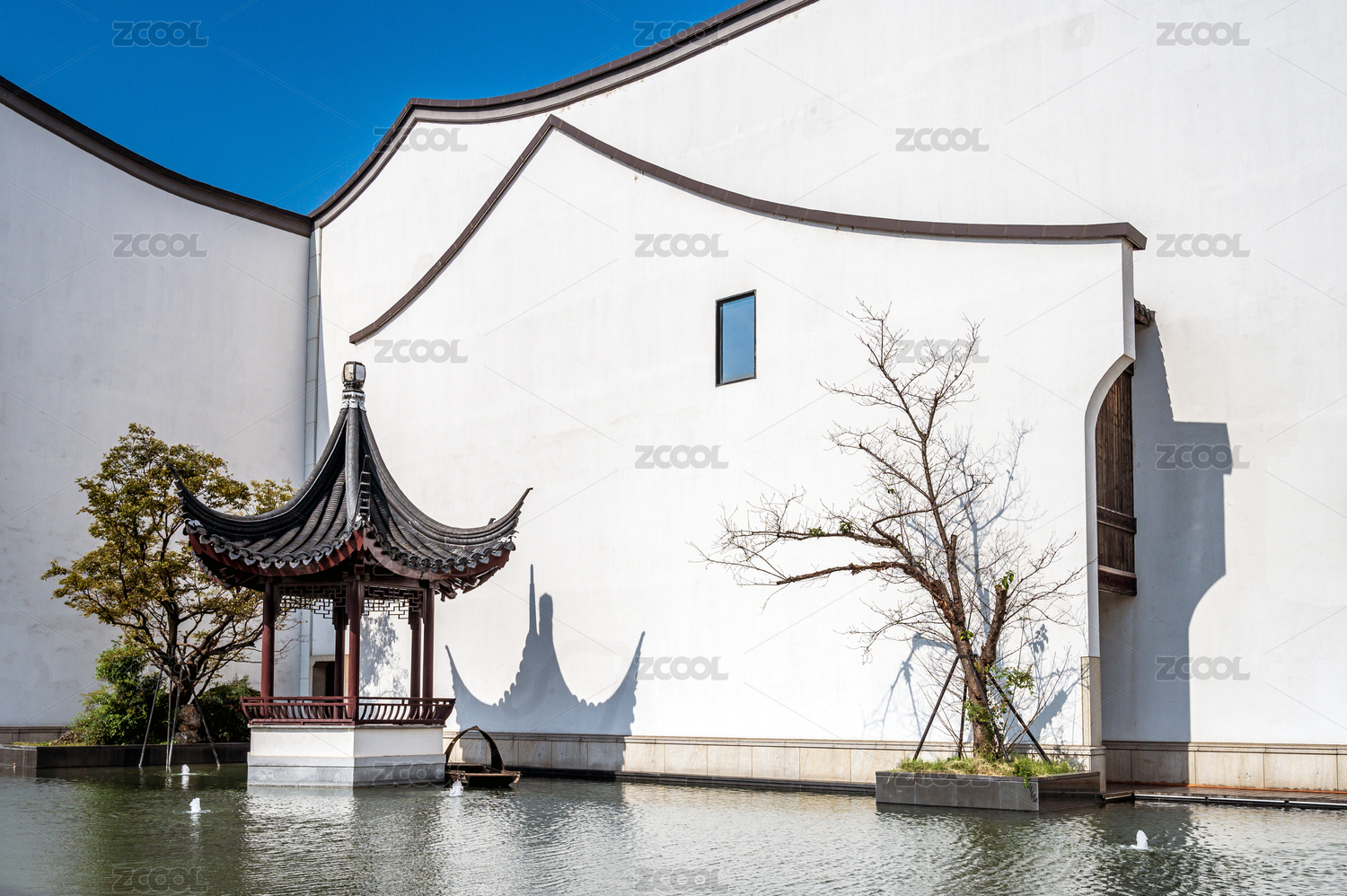 中式园林庭院及白墙灰瓦徽派建筑