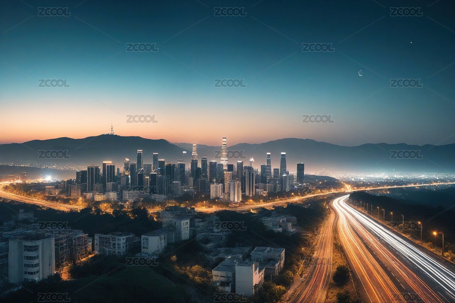 傍晚时分的城市立交桥夜景和繁忙的车流