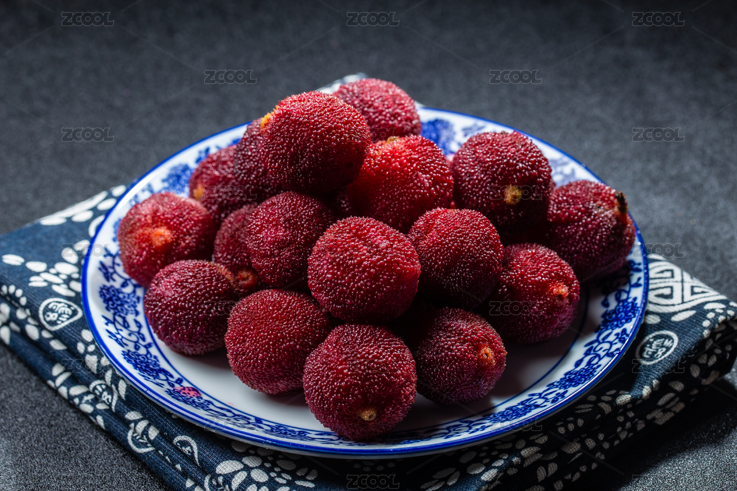 一盘红色的中国杨梅放在黑色背景布上