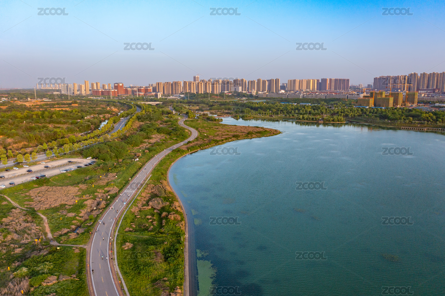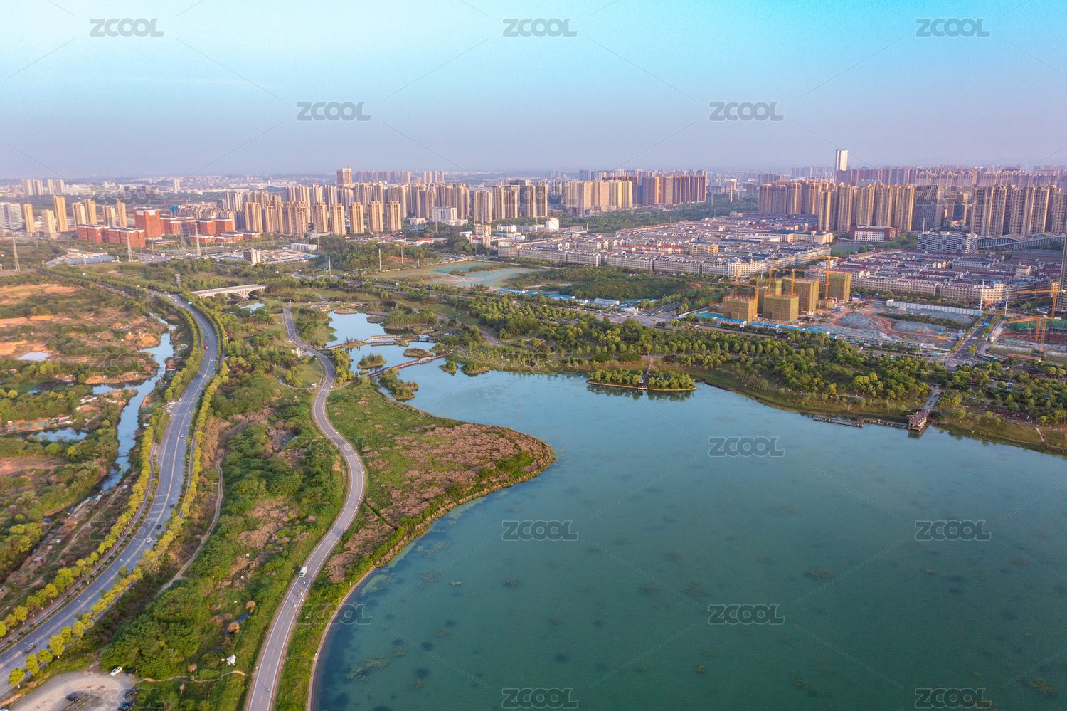 航拍河南郑州象湖生态湿地公园及贾鲁河水系