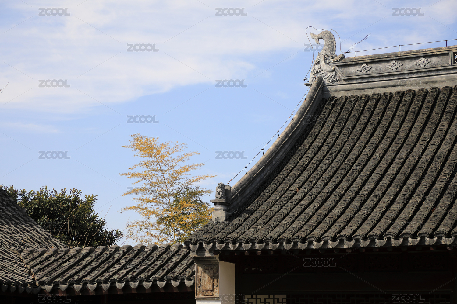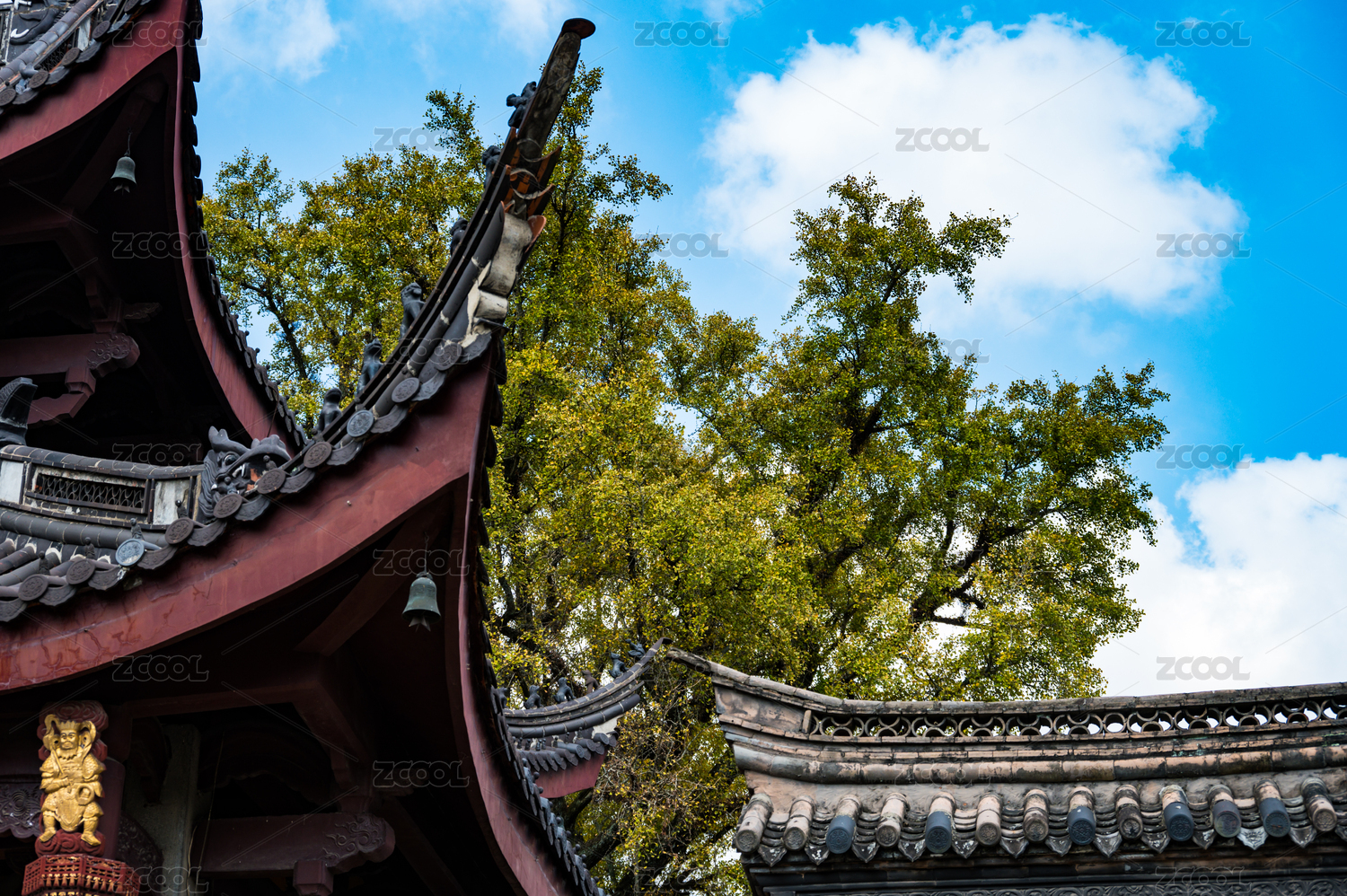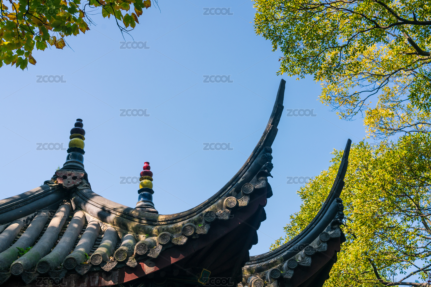 蓝天下深秋温暖的阳光照在中国古典建筑的屋顶和树叶上