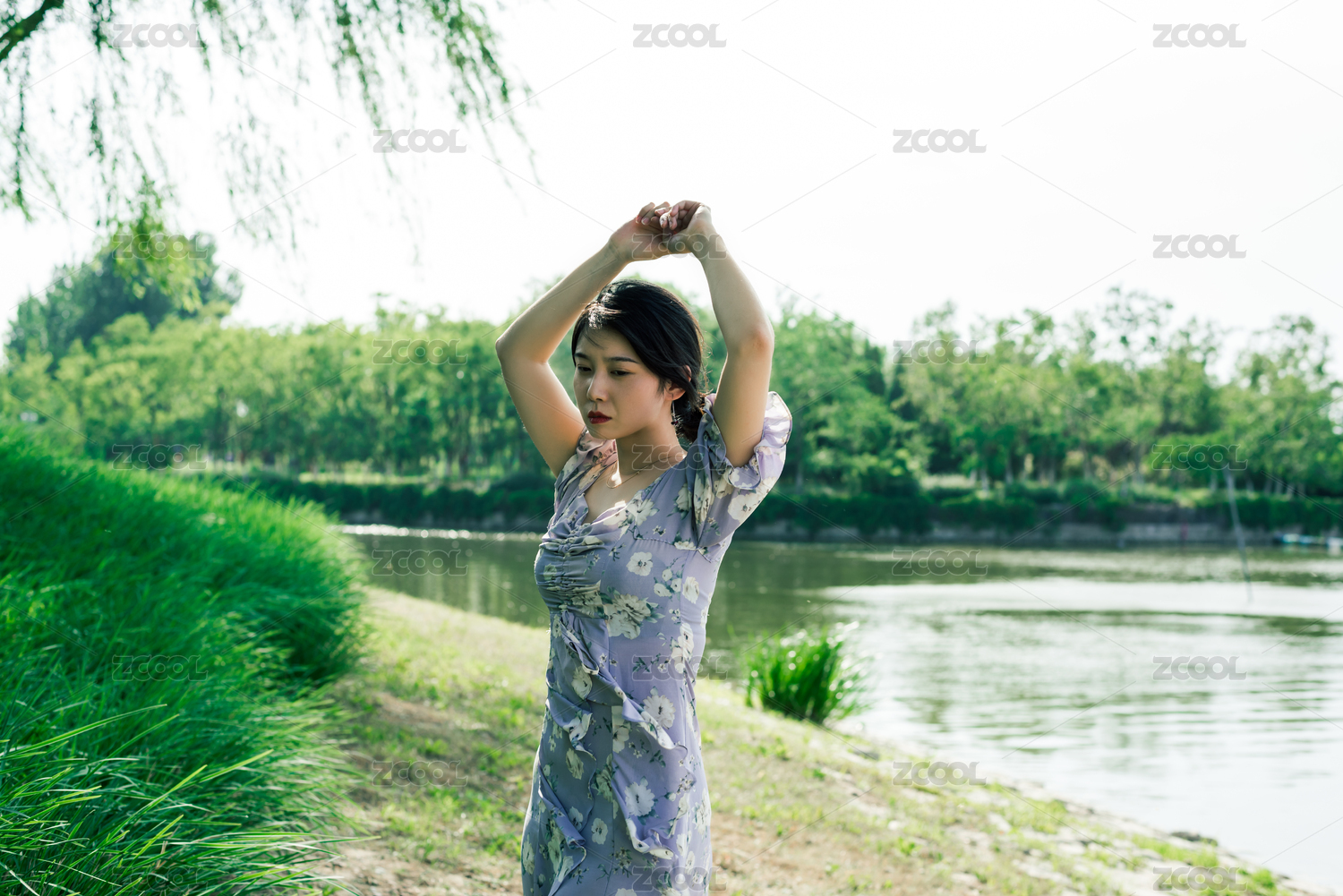 年轻美丽的女孩举着双手站在草地上,轻松自在的生活方式