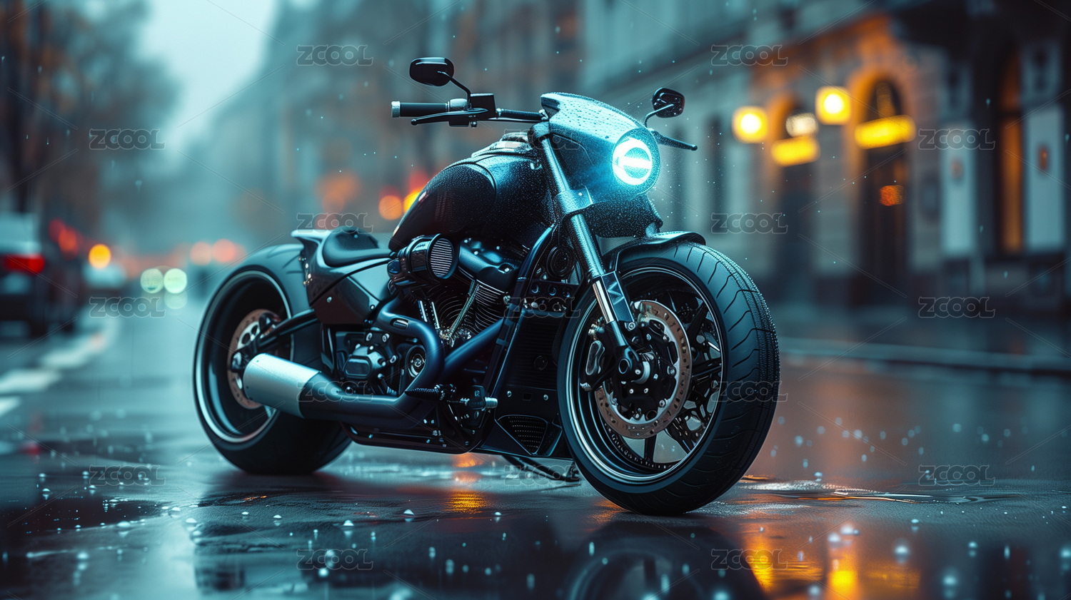 摩托车,夜晚,街道,雨水,反光,湿滑,路灯,光影,复古,黑色