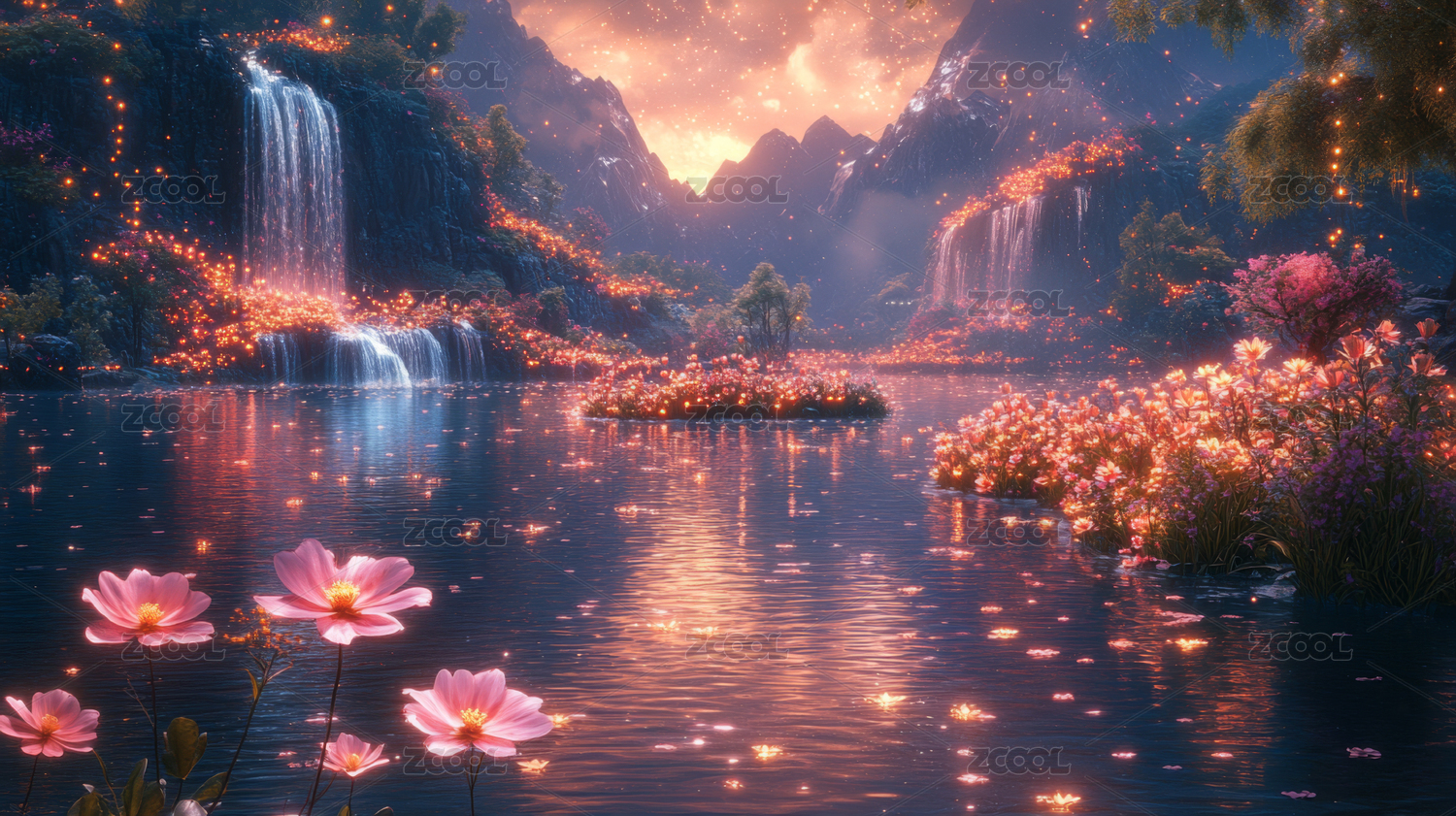 莲花盛开瀑布流水