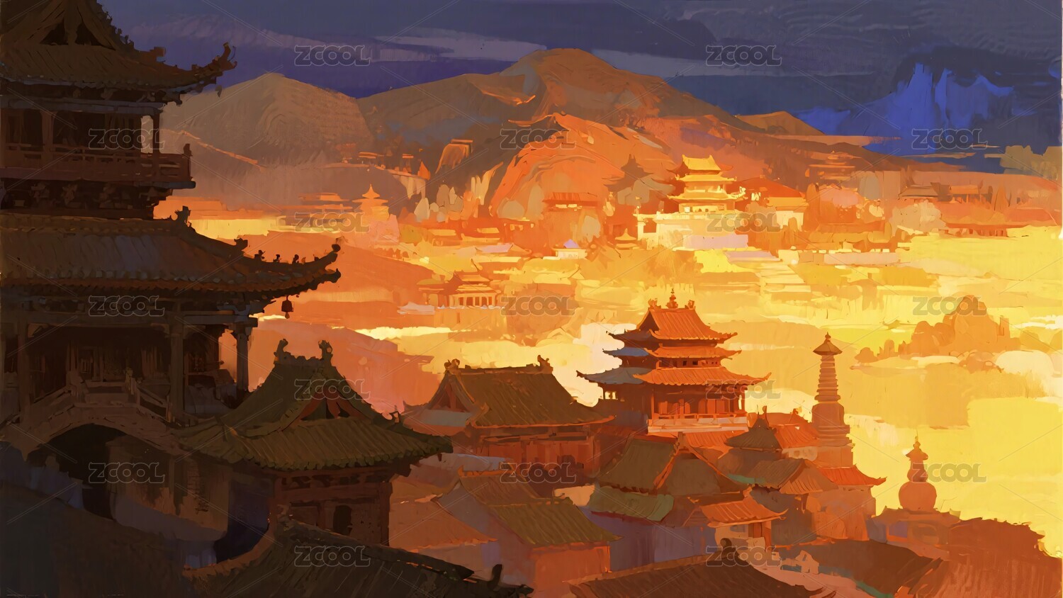 被摧毁的古代中国城市,数字绘画。