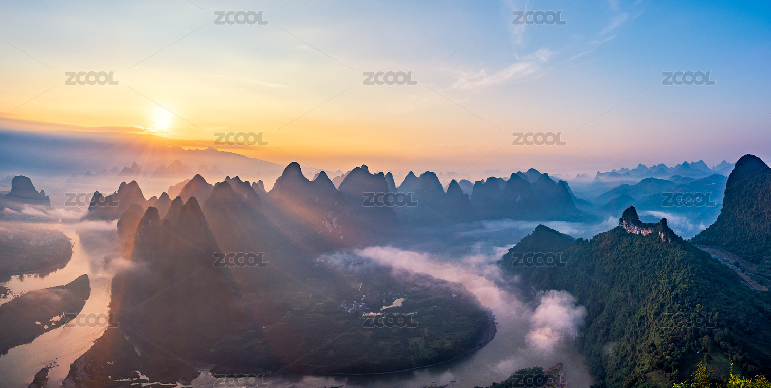 日出时桂林漓江峡谷中的云雾和水面上的竹筏
