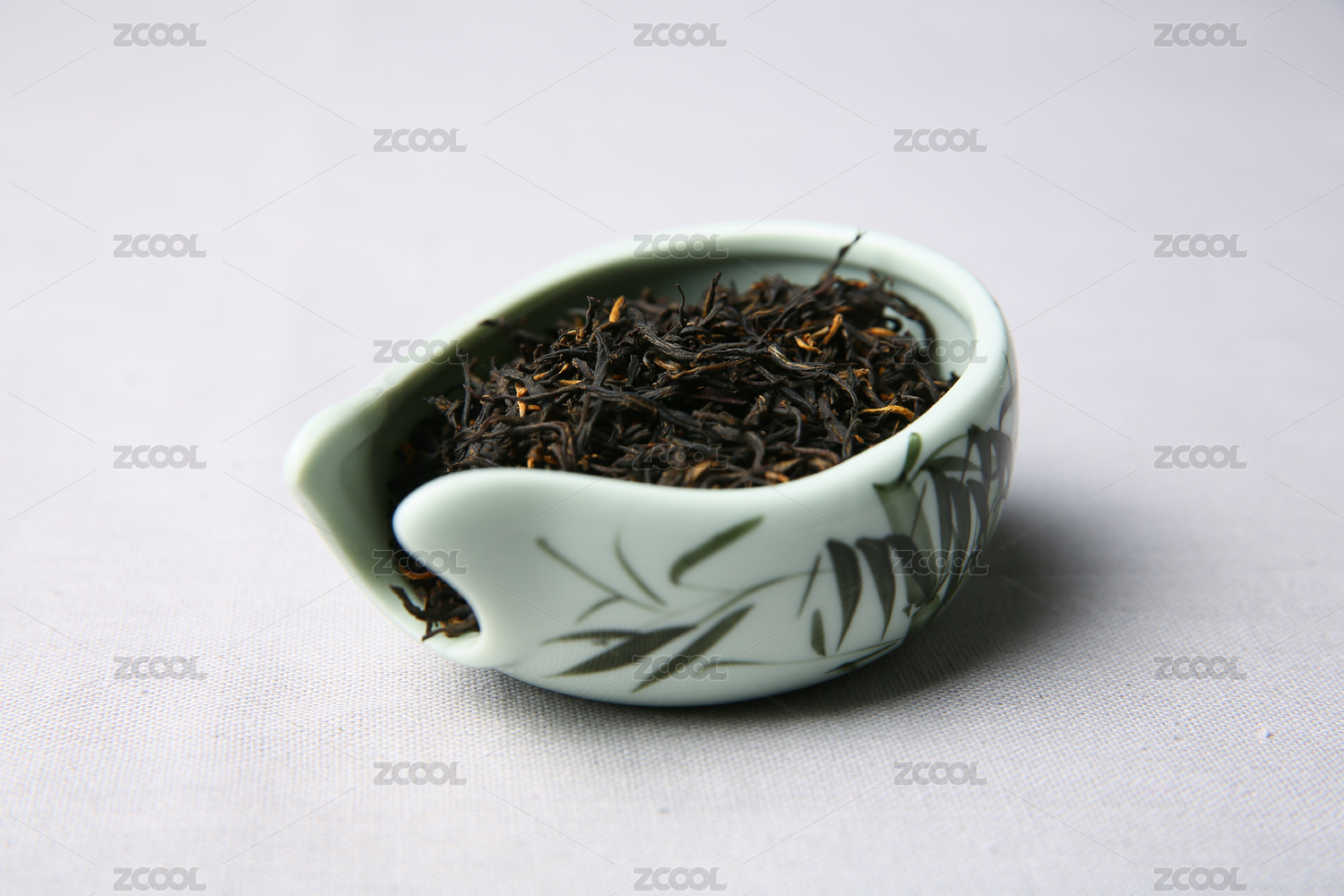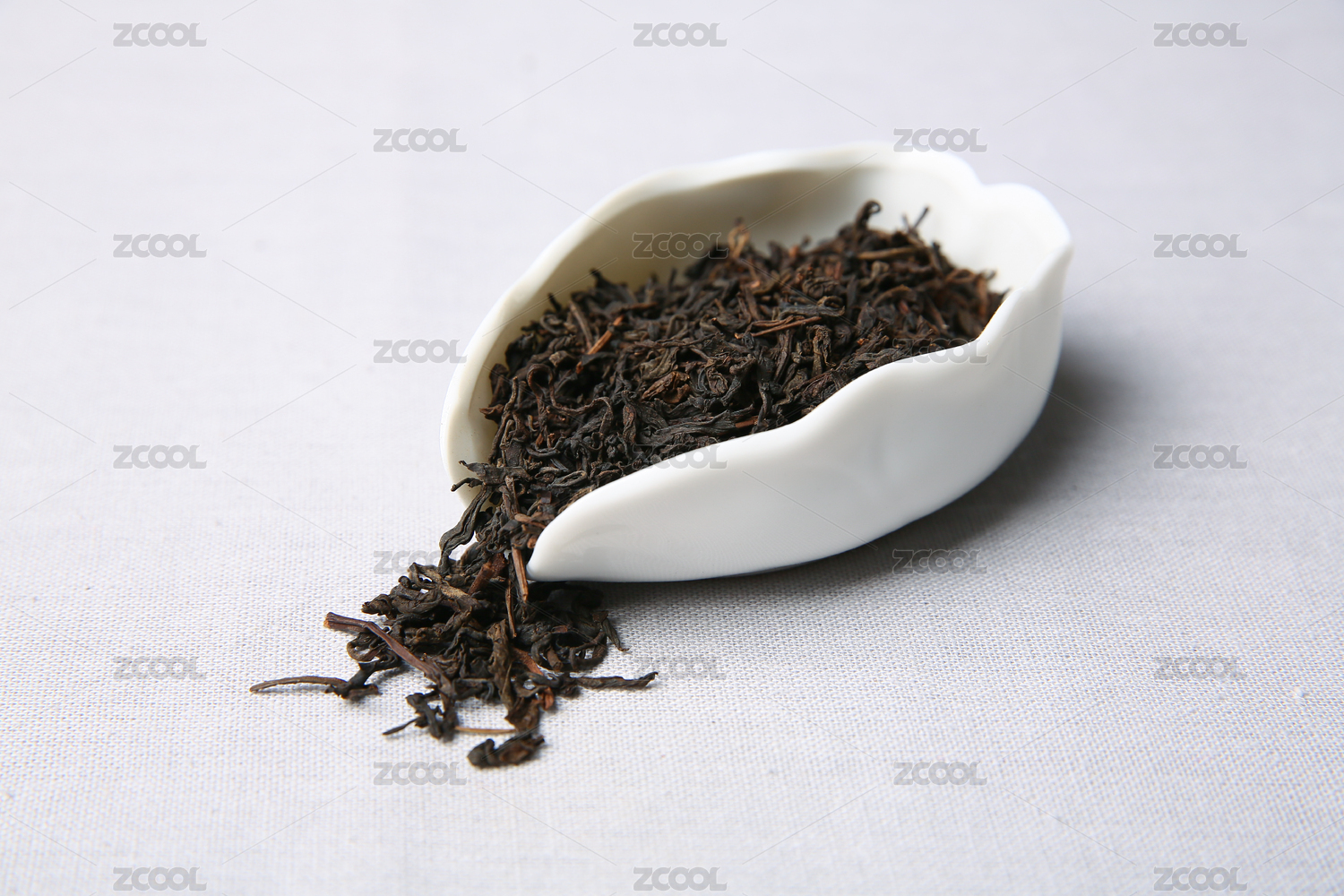 普洱茶生茶茶叶放在瓷盘里俯拍
