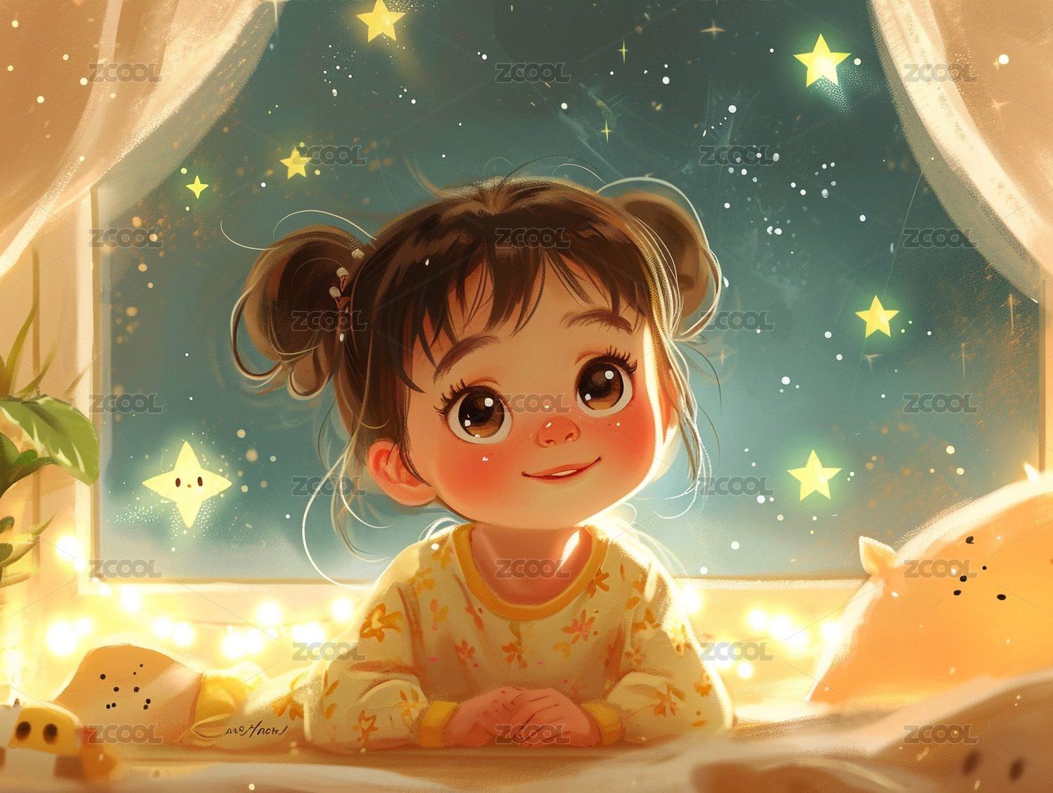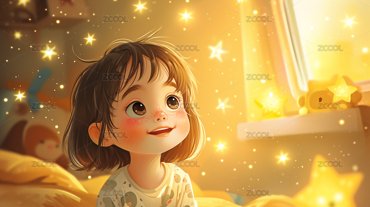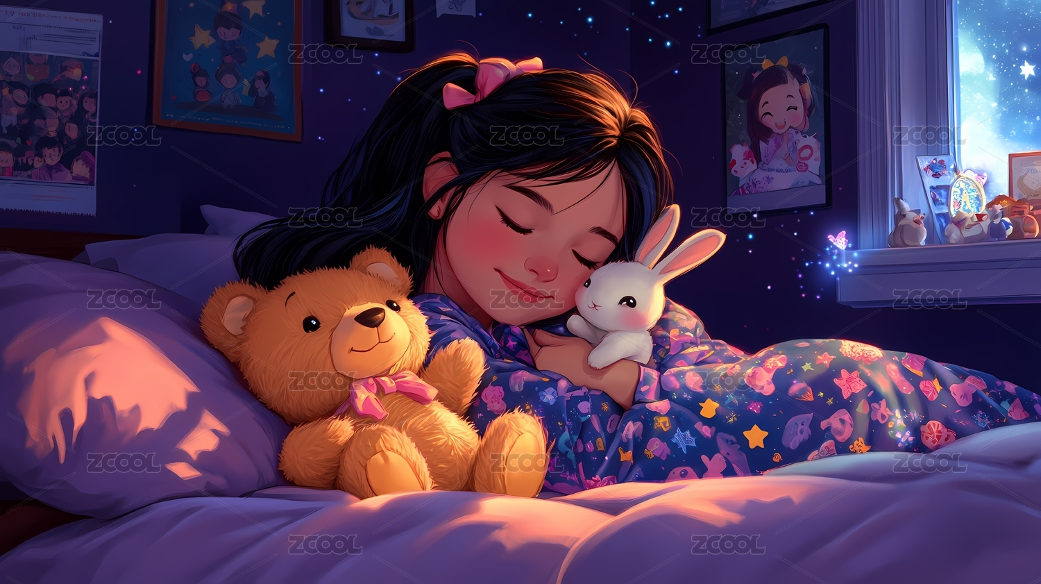 小女孩,儿童,儿童节,玩具熊,童年,卧室,儿童插画