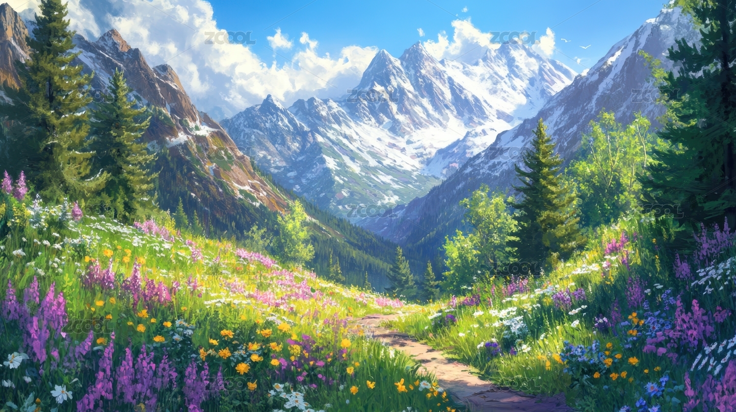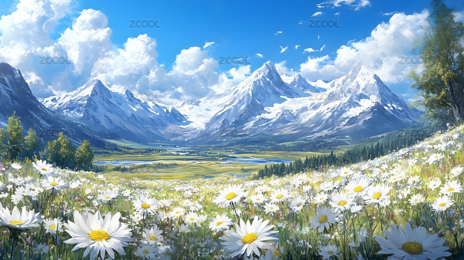 雪山,山谷,草地,鲜花,白云,蓝天,绿色,树木,村庄,高山