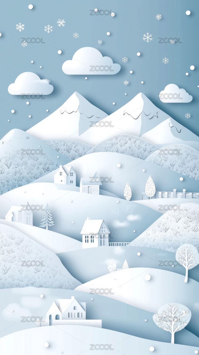 冬天白天有雪山坡上的木屋3D卡通立体插画