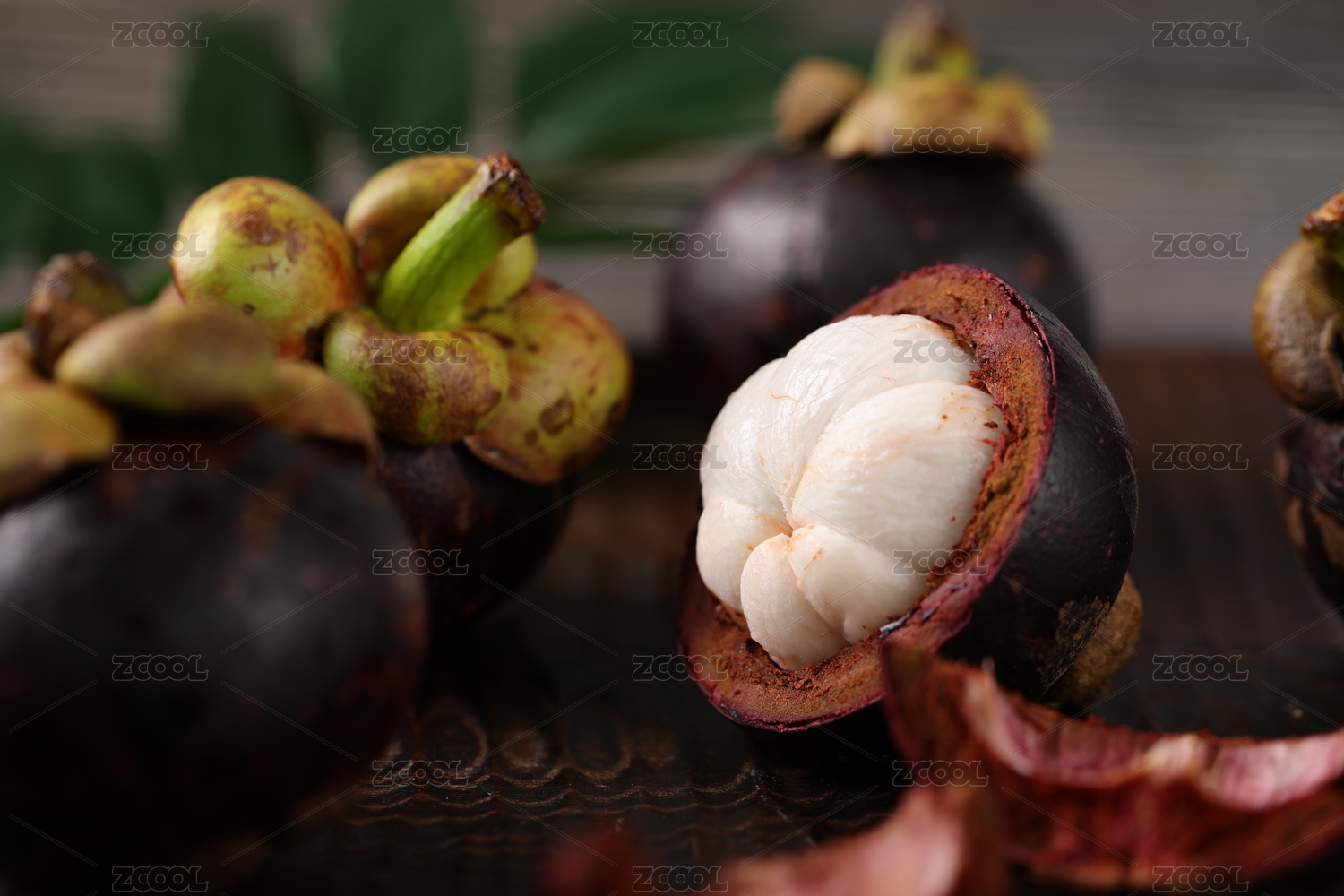 木板上放着一个油麻竹和一个削开皮泰国山竹