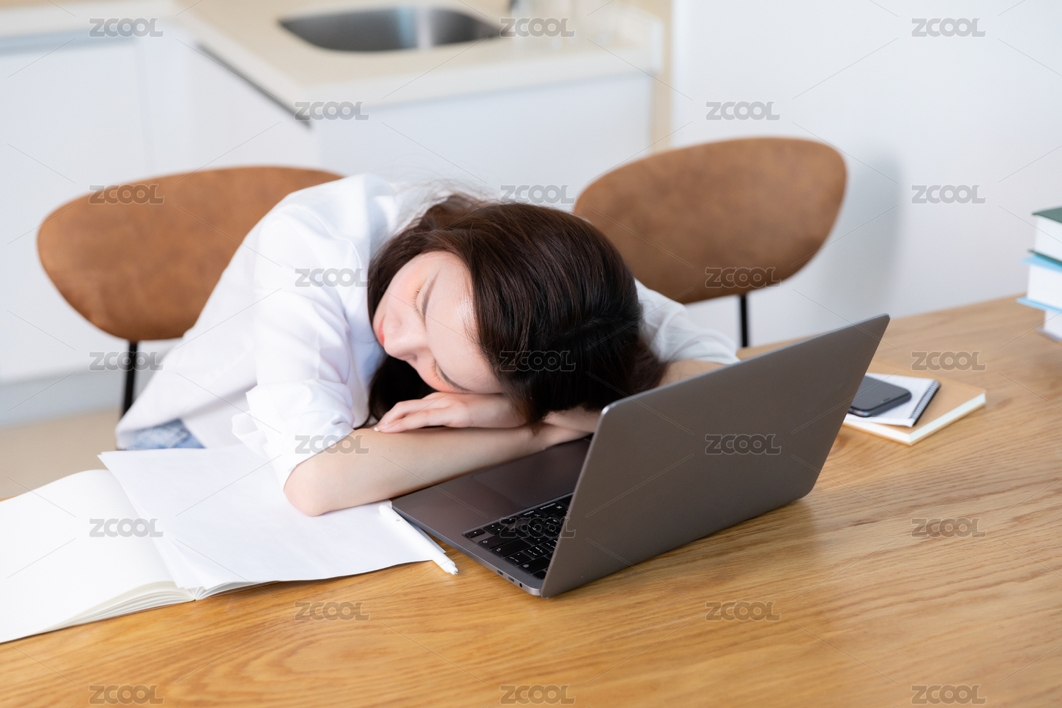 亚裔女商人困加班深夜坐在办公桌。在室内办公背景