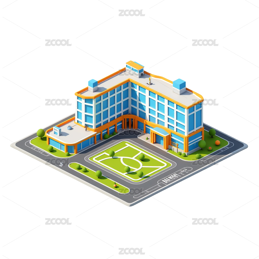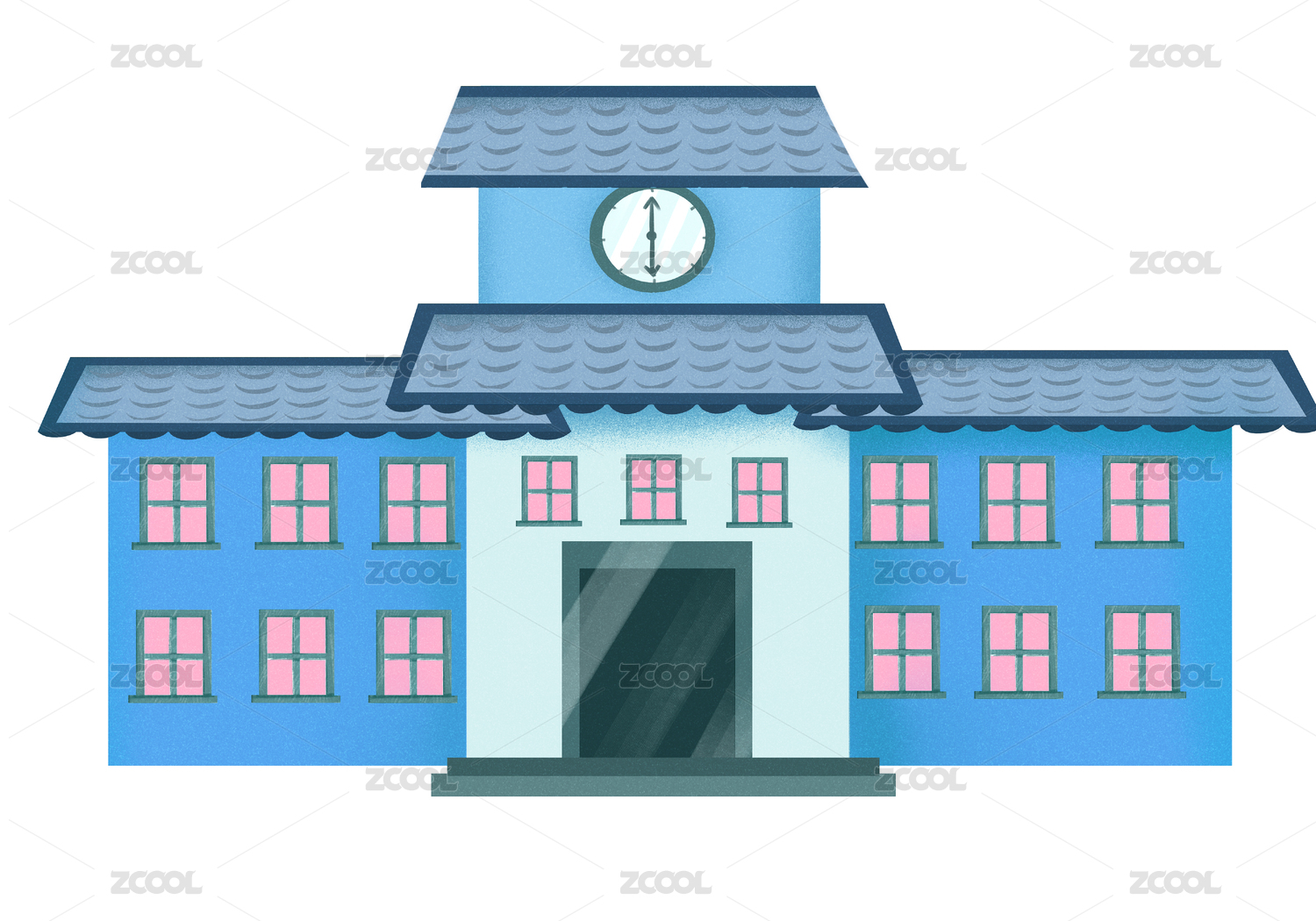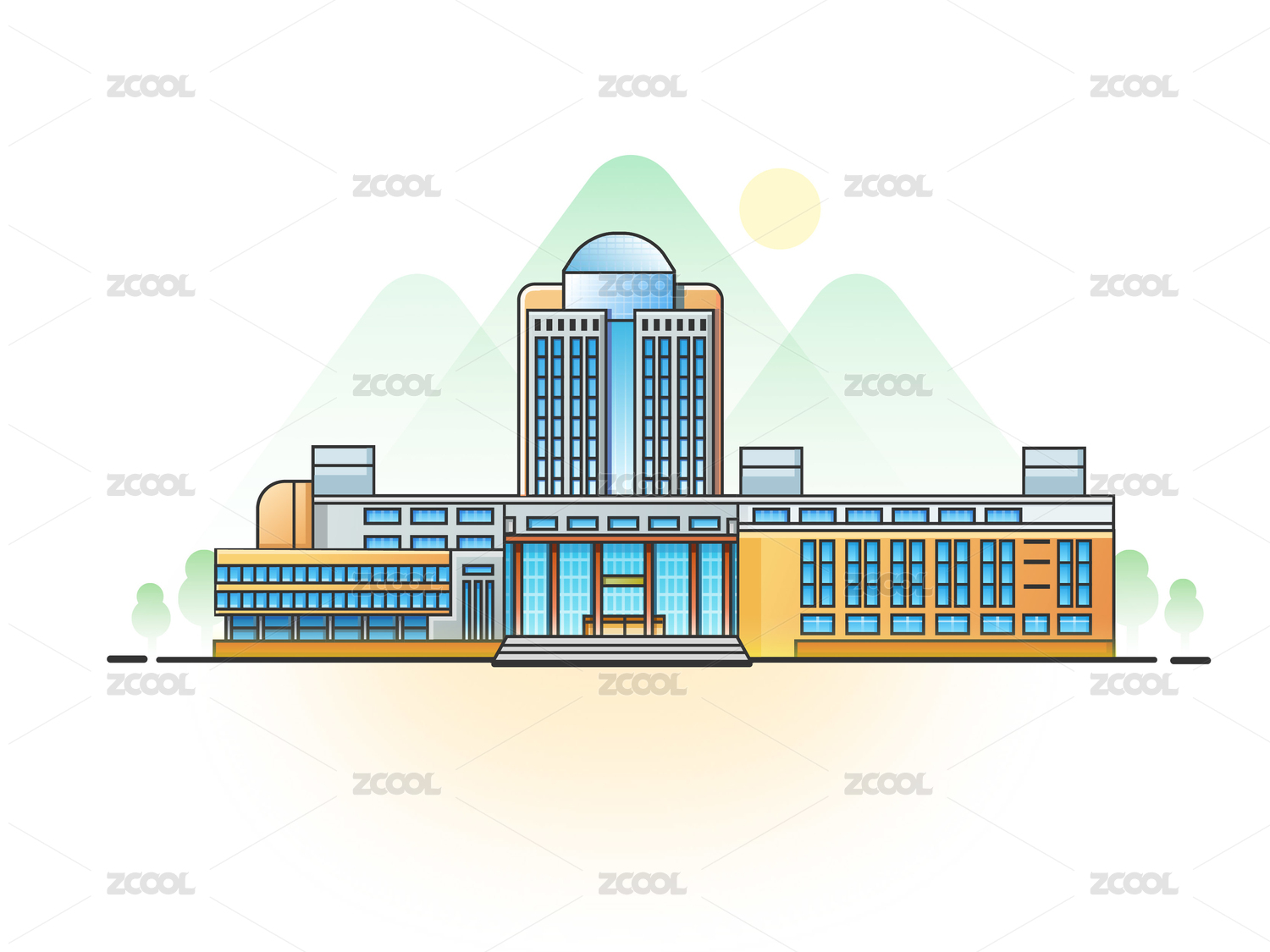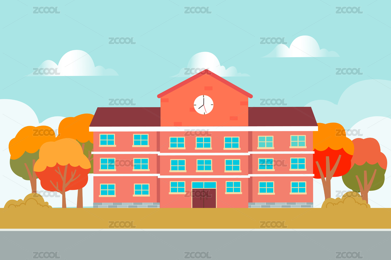 扁平插画校园建筑教学楼宿舍楼天空创意卡通