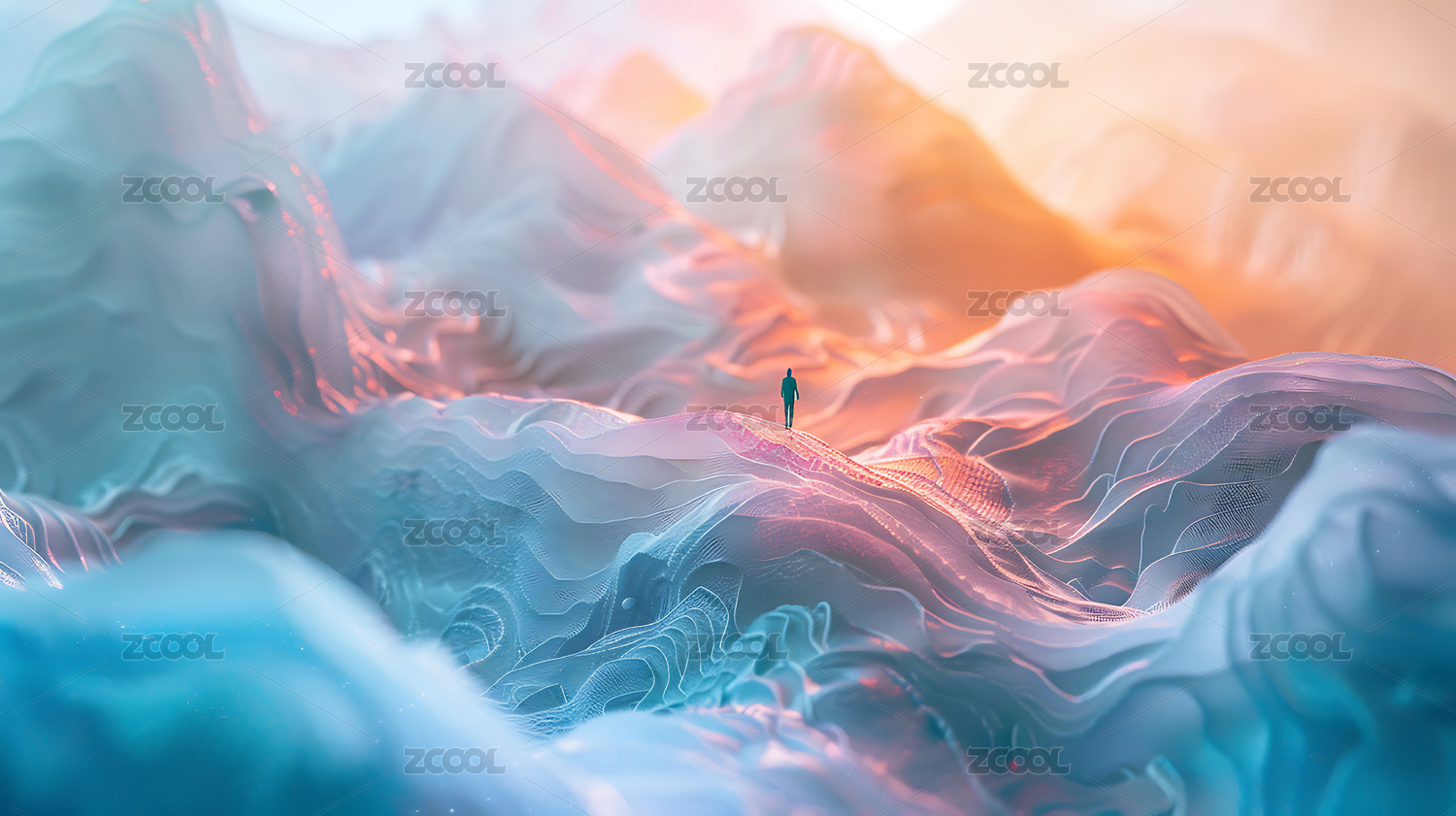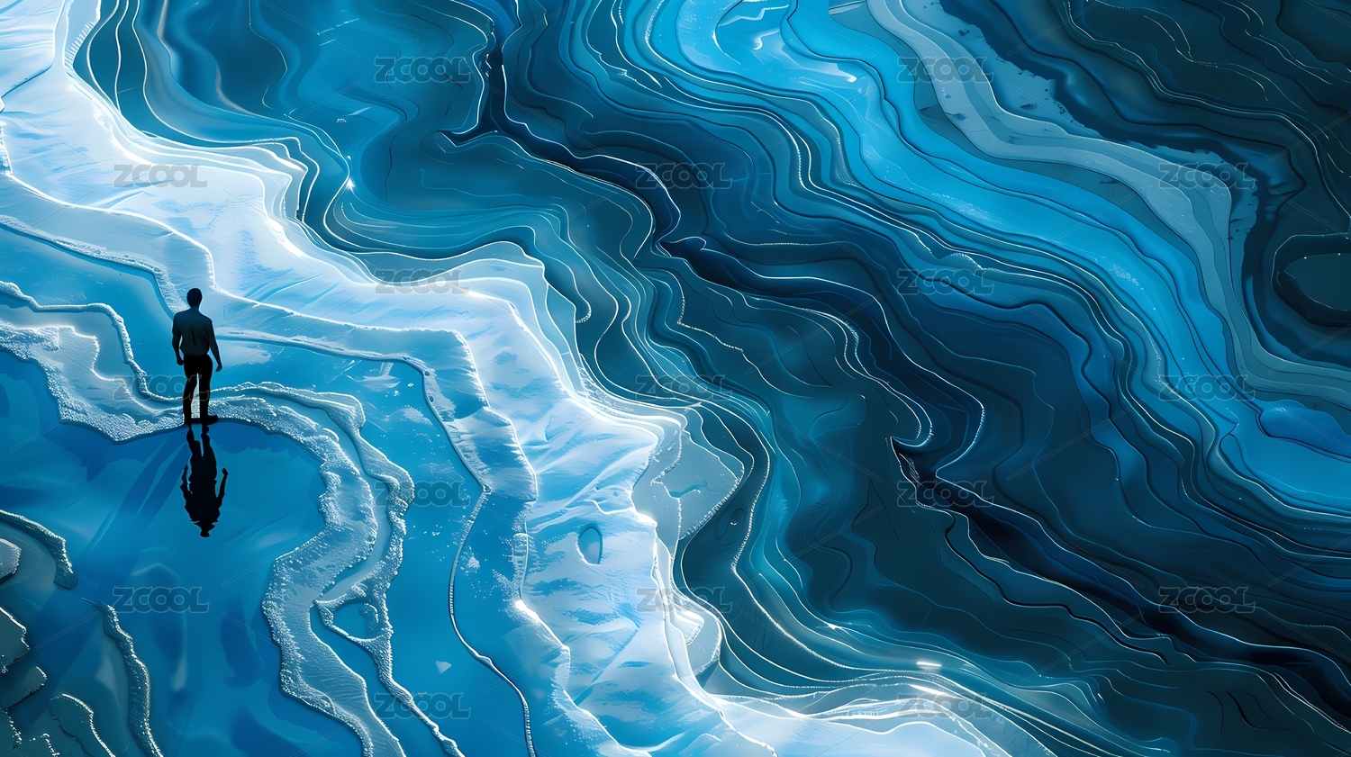 蓝色抽象地貌中的人