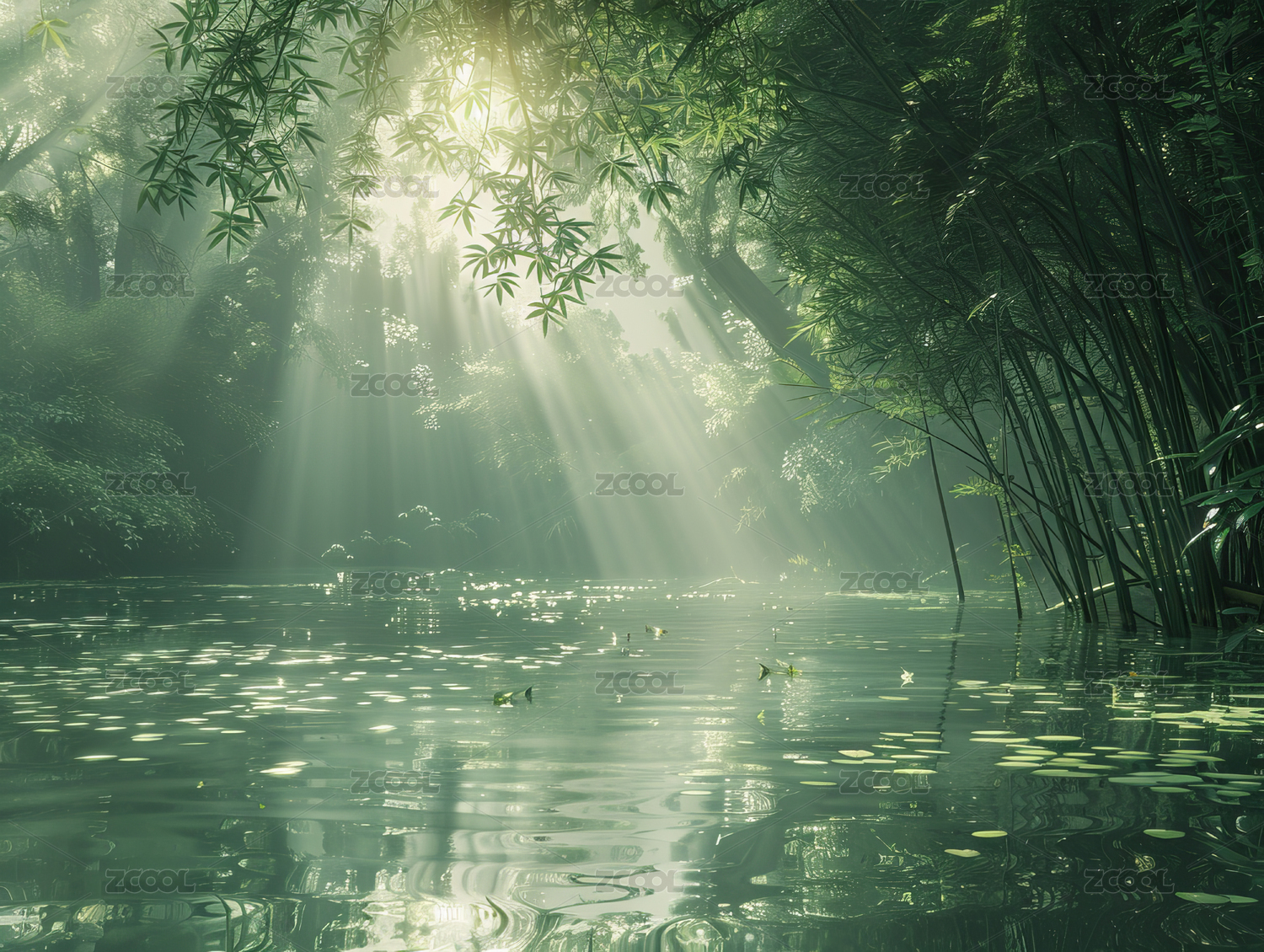 竹子,溪流,阳光,绿色,风景,射线,水彩,油画,墨水,清新