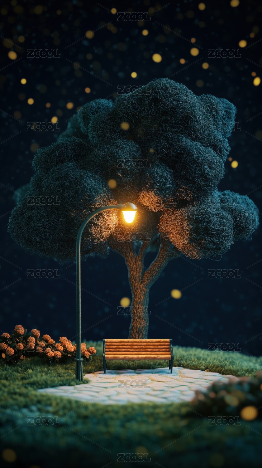 晚上公园大树路灯下羊毛毡长椅3D卡通插画