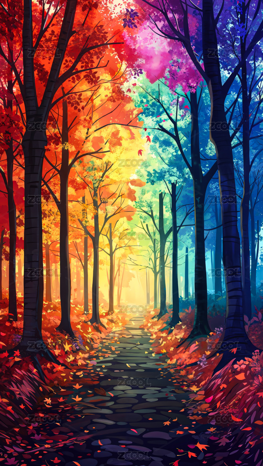 秋天唯美梦幻彩虹树林风景