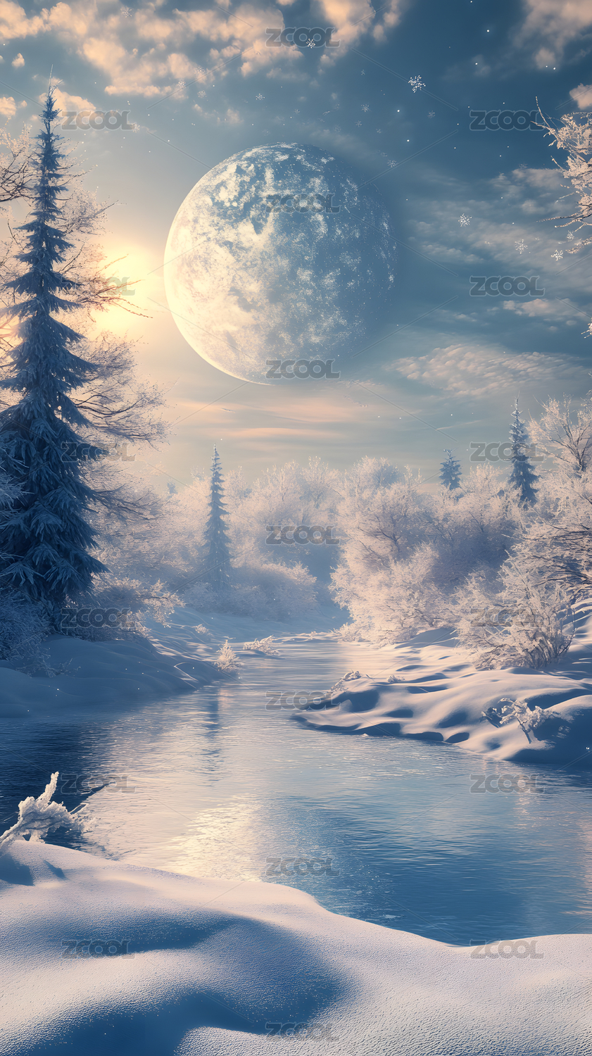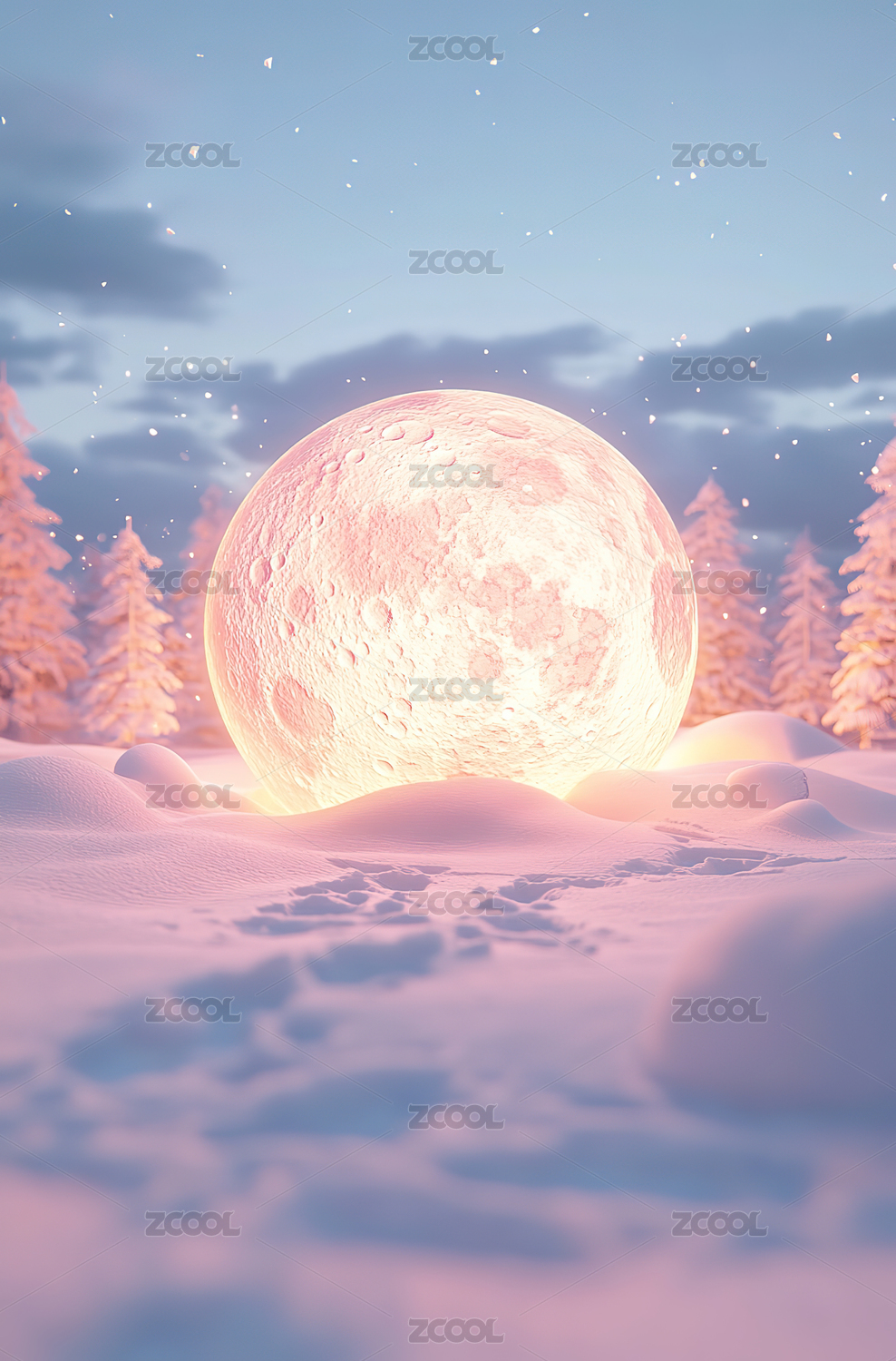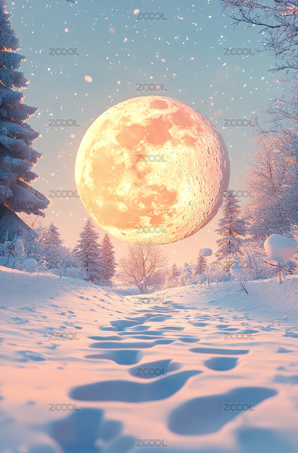 海,设计,雪,场景,金,白,云,环境,月亮,树