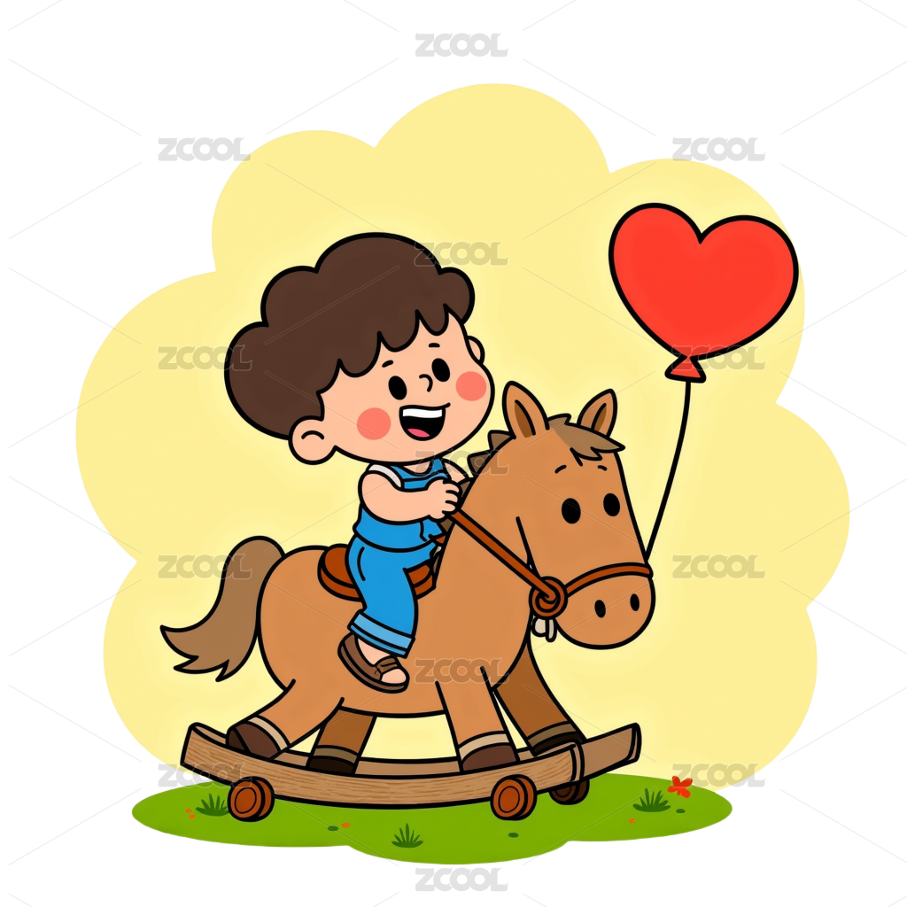 卡通男孩骑木马玩具开心大笑小朋友儿童插画