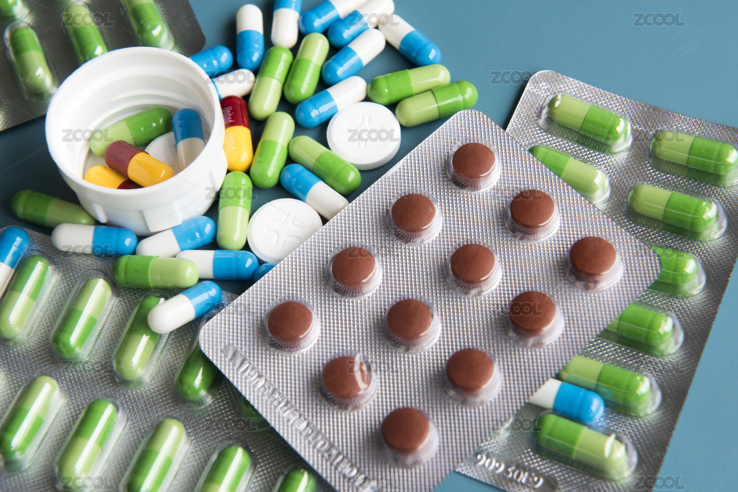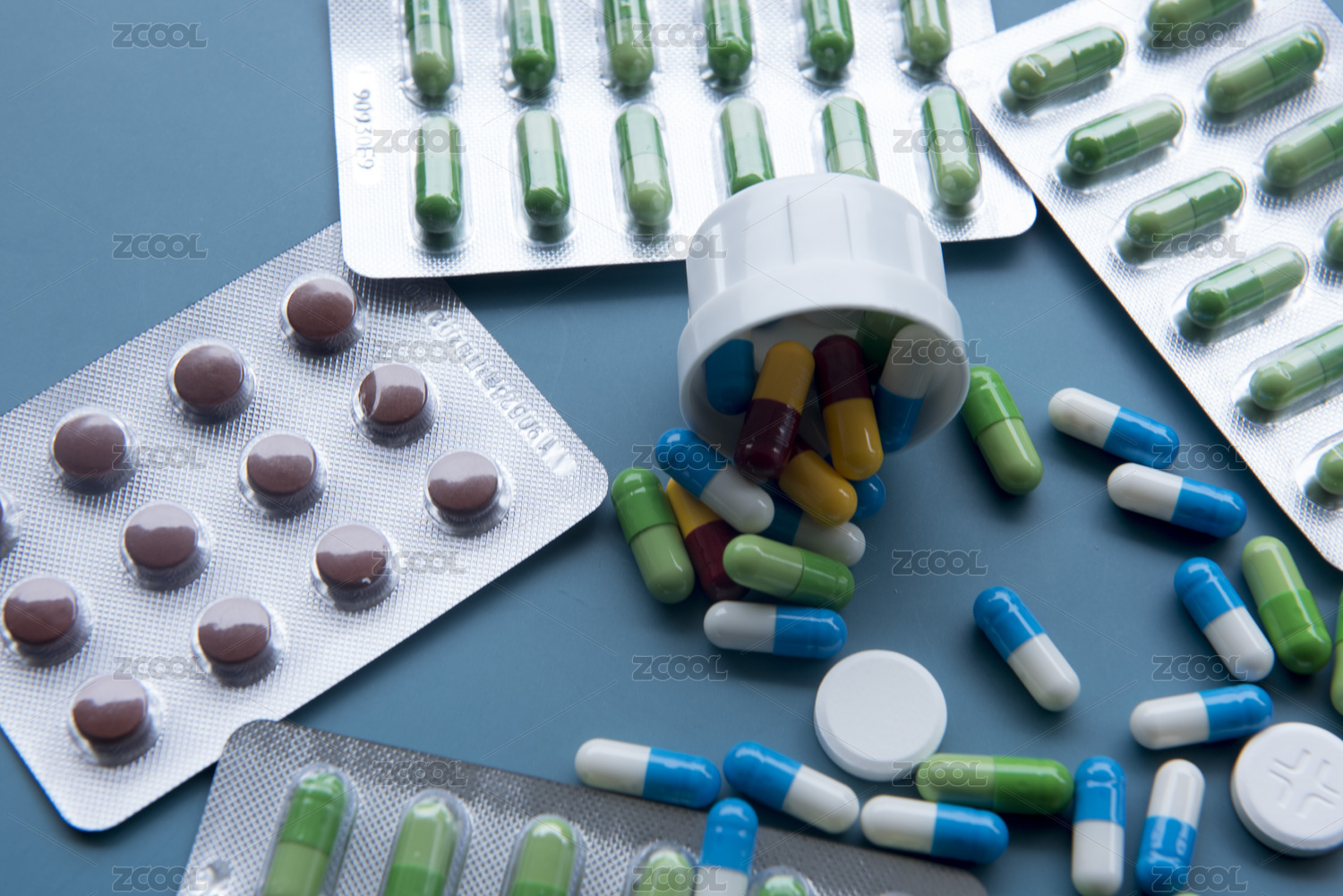 在蓝色背景上用于医疗治疗用中西药药丸胶囊