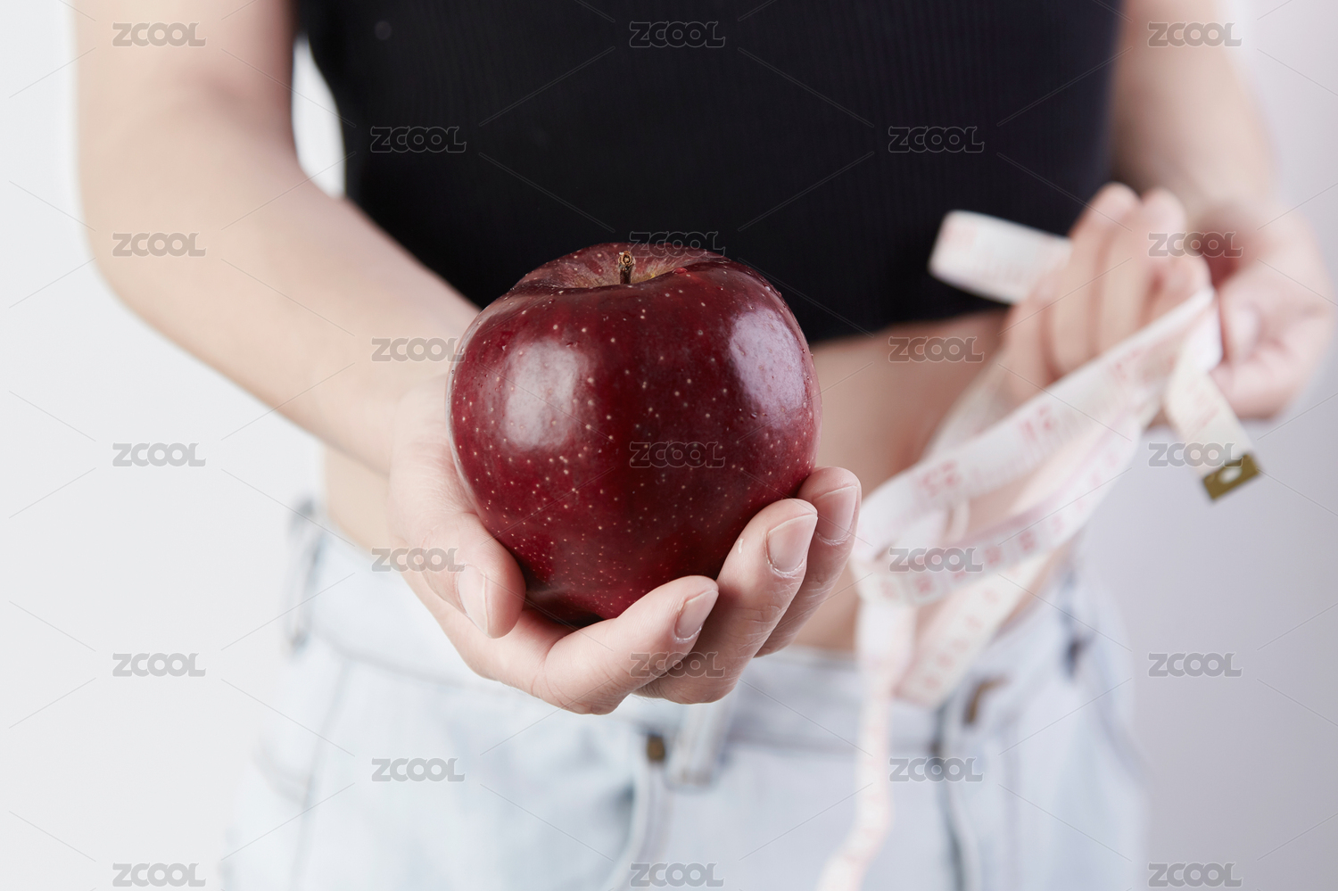 拥有完美苗条身材的女人用手拿着一个苹果。健康饮食概念