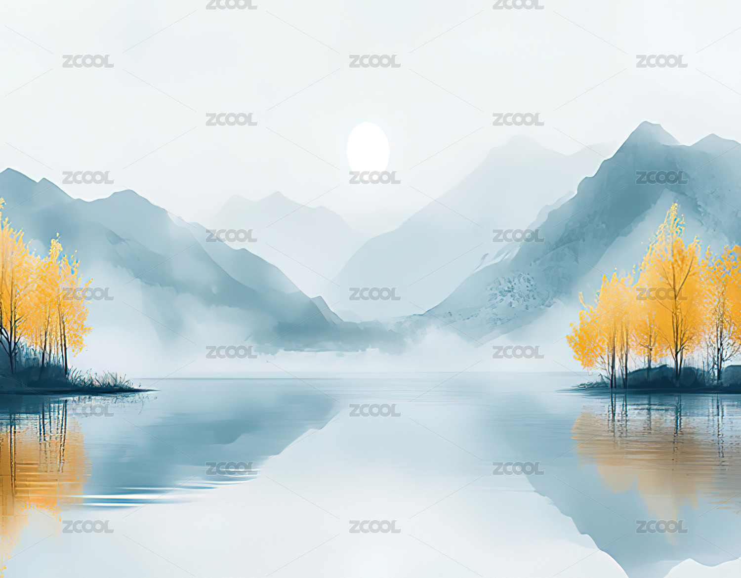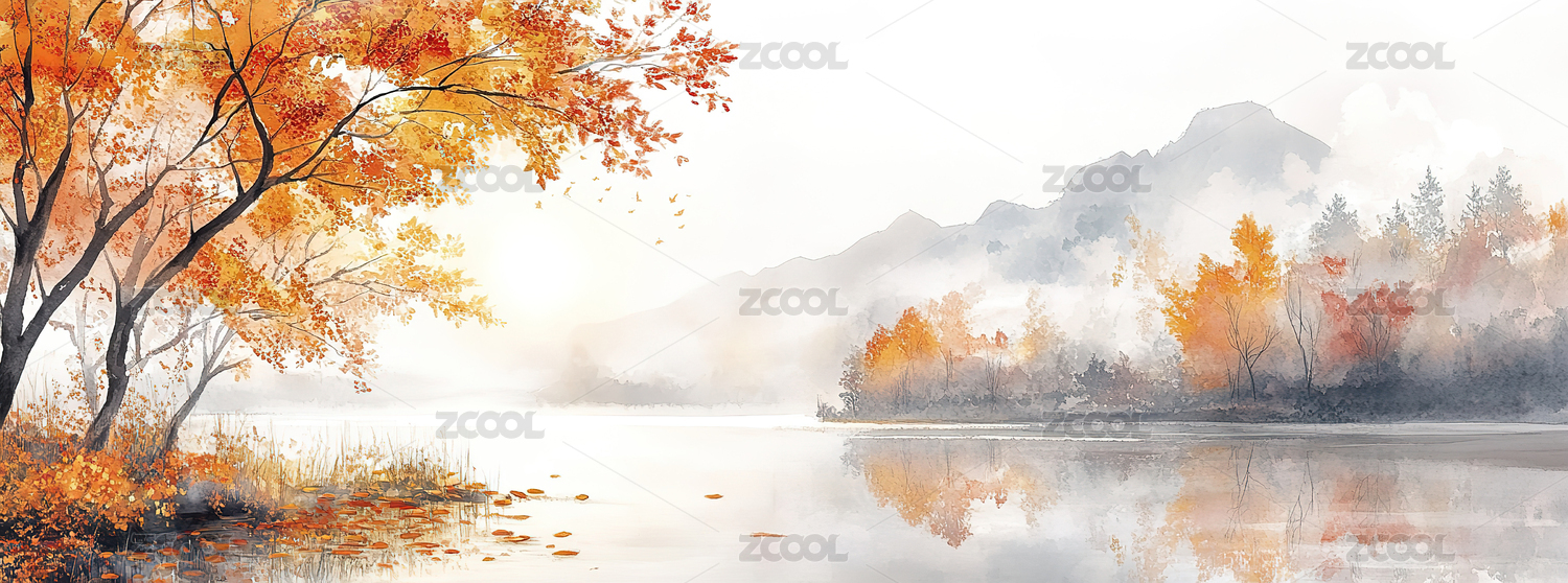 秋天户外山水风光淡彩水墨风格