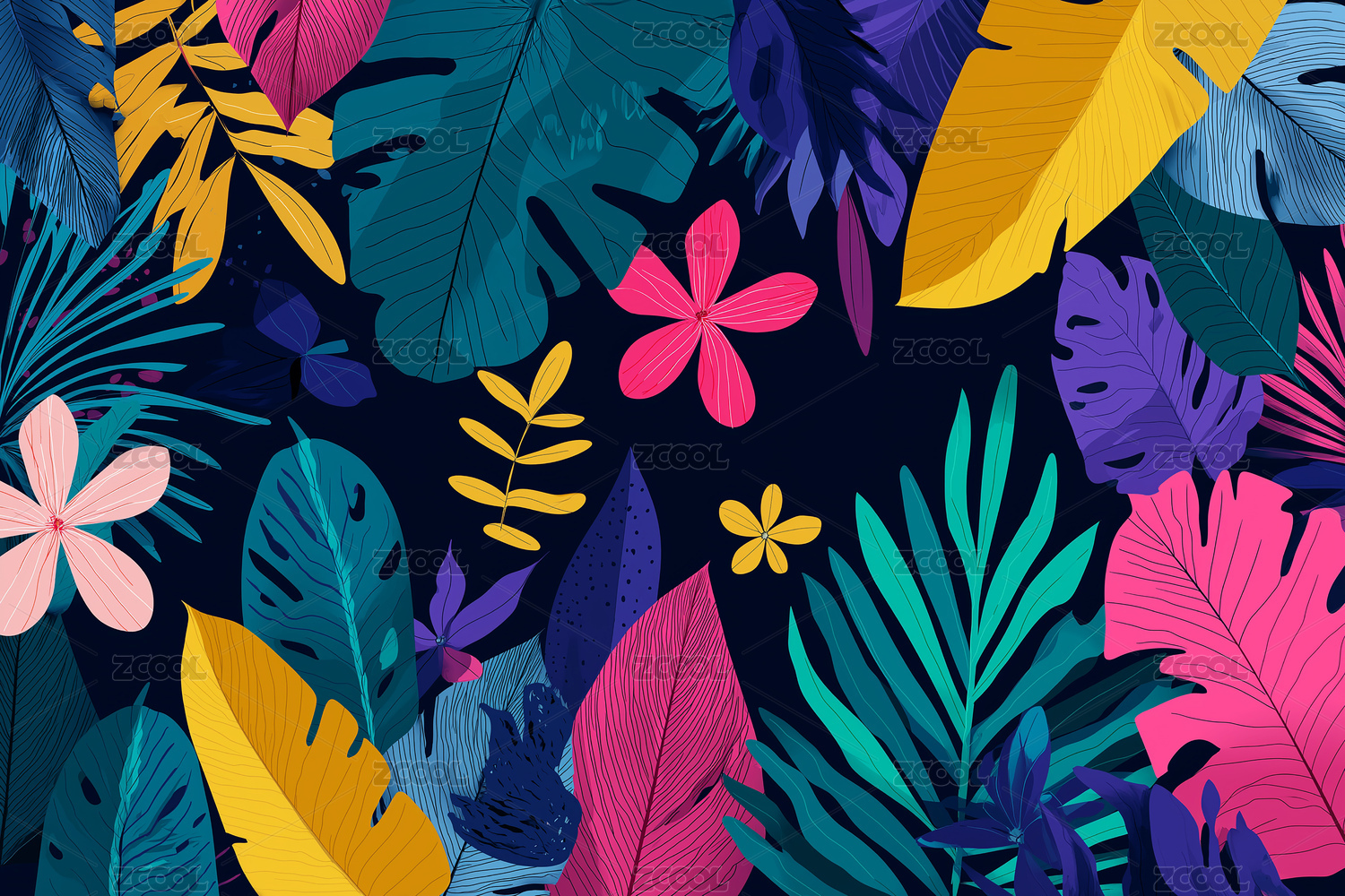 深蓝色和霓虹橙色热带树叶的活力矢量插图